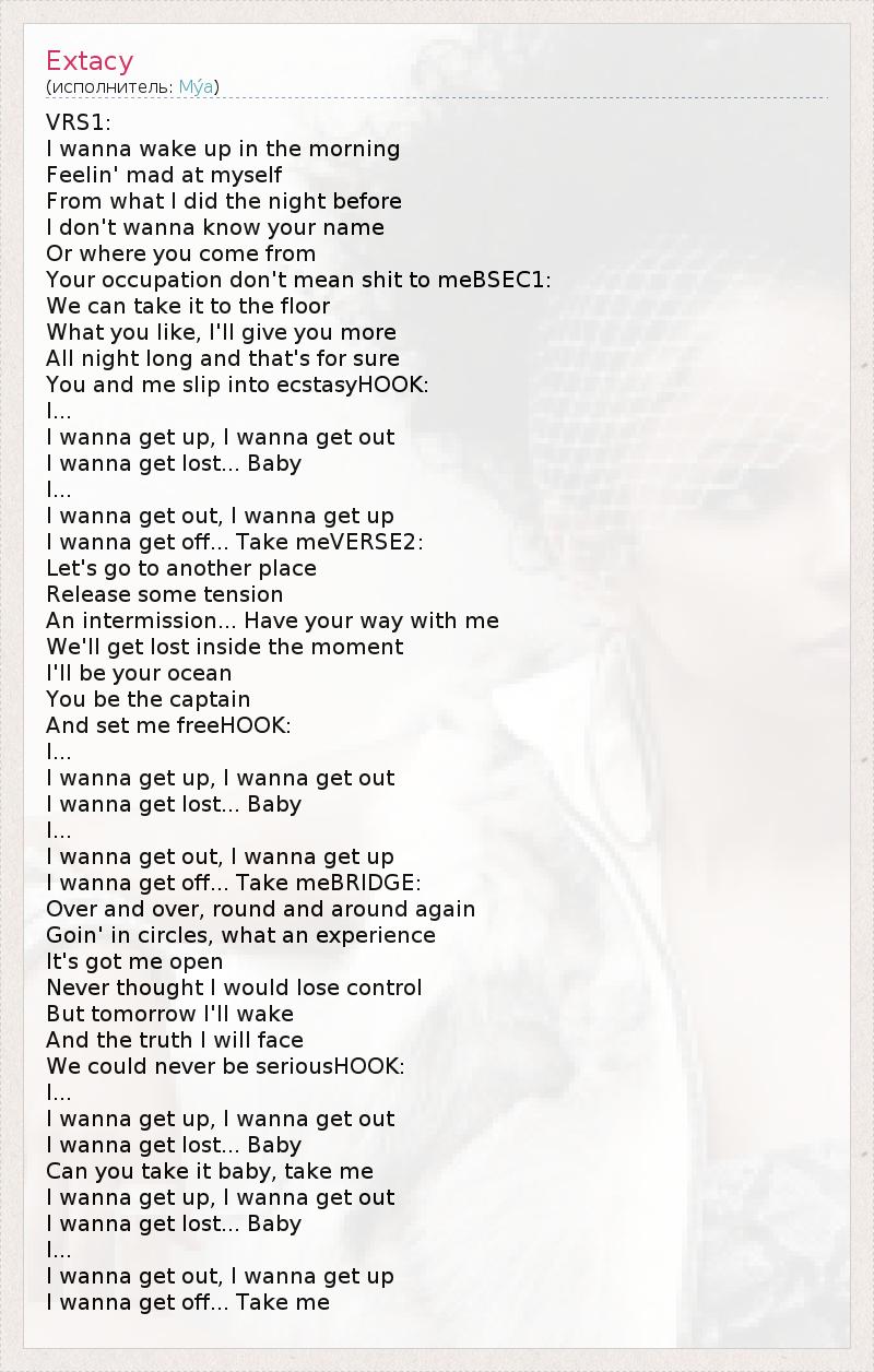 VRS1: I wanna wake up in the morning Feelin' mad at myself From what I did the night before I don't wanna know your name Or where you come from Your occupation don't mean shit to meBSEC1: We can take it to the floor What you like, I'll give you more All night long and that's for sure You and me slip into ecstasyHOOK: I... I wanna get up, I wanna get out I wanna get lost... Baby I... I wanna get out, I wanna get up I wanna get off... Take meVERSE2: Let's go to another place Release some tension An intermission... Have your way with me We'll get lost inside the moment I'll be your ocean You be the captain And set me freeHOOK: I... I wanna get up, I wanna get out I wanna get lost... Baby I... I wanna get out, I wanna get up I wanna get off... Take meBRIDGE: Over and over, round and around again Goin' in circles, what an experience It's got me open Never thought I would lose control But tomorrow I'll wake And the truth I will face We could never be seriousHOOK: I... I wanna get up, I wanna get out I wanna get lost... Baby Can you take it baby, take me I wanna get up, I wanna get out I wanna get lost... Baby I... I wanna get out, I wanna get up I wanna get off... Take me