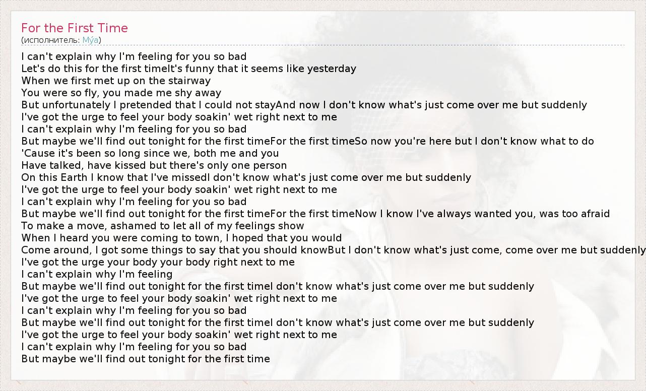 I can't explain why I'm feeling for you so bad Let's do this for the first timeIt's funny that it seems like yesterday When we first met up on the stairway You were so fly, you made me shy away But unfortunately I pretended that I could not stayAnd now I don't know what's just come over me but suddenly I've got the urge to feel your body soakin' wet right next to me I can't explain why I'm feeling for you so bad But maybe we'll find out tonight for the first timeFor the first timeSo now you're here but I don't know what to do 'Cause it's been so long since we, both me and you Have talked, have kissed but there's only one person On this Earth I know that I've missedI don't know what's just come over me but suddenly I've got the urge to feel your body soakin' wet right next to me I can't explain why I'm feeling for you so bad But maybe we'll find out tonight for the first timeFor the first timeNow I know I've always wanted you, was too afraid To make a move, ashamed to let all of my feelings show When I heard you were coming to town, I hoped that you would Come around, I got some things to say that you should knowBut I don't know what's just come, come over me but suddenly I've got the urge your body your body right next to me I can't explain why I'm feeling But maybe we'll find out tonight for the first timeI don't know what's just come over me but suddenly I've got the urge to feel your body soakin' wet right next to me I can't explain why I'm feeling for you so bad But maybe we'll find out tonight for the first timeI don't know what's just come over me but suddenly I've got the urge to feel your body soakin' wet right next to me I can't explain why I'm feeling for you so bad But maybe we'll find out tonight for the first time