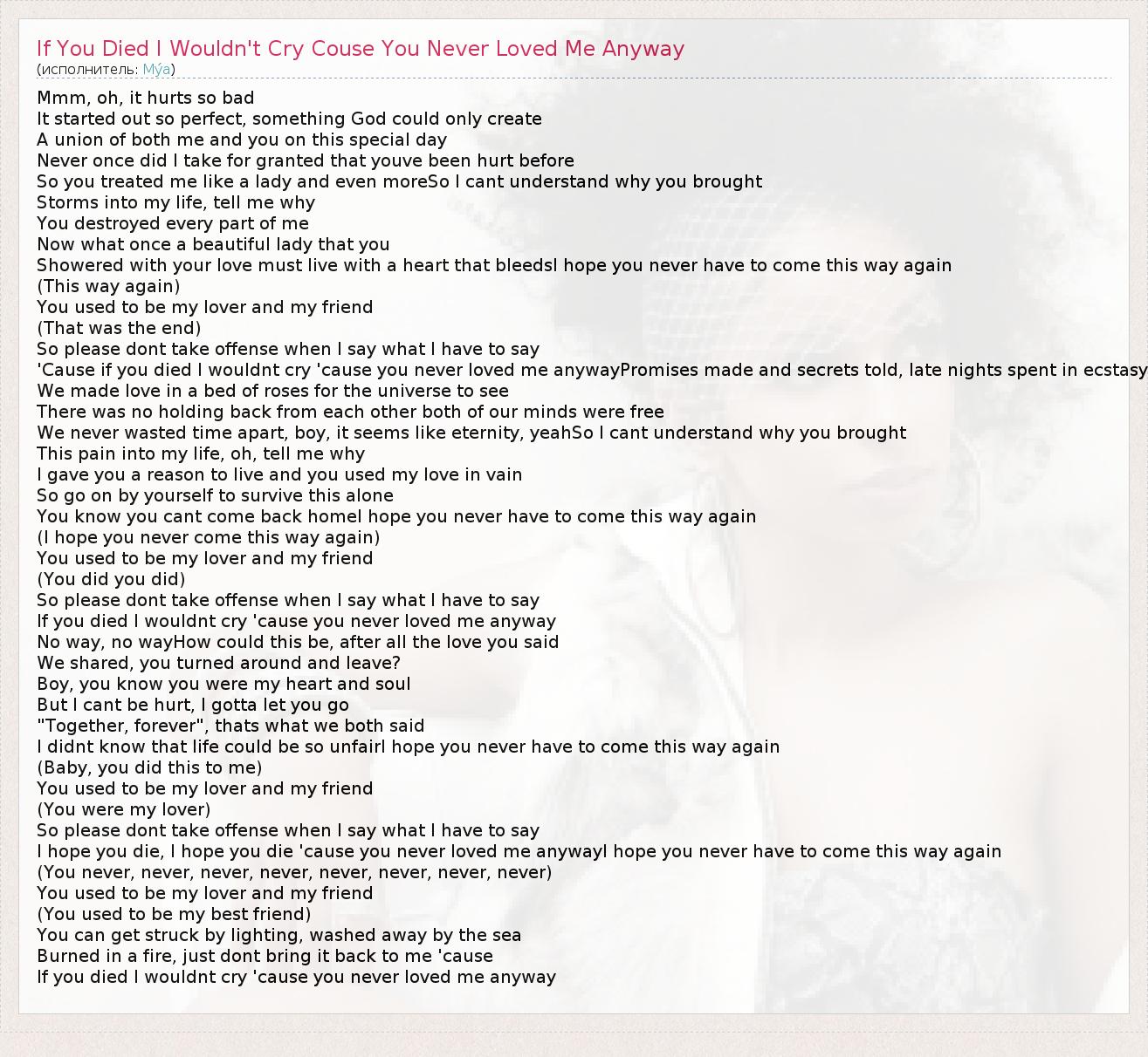 Mmm, oh, it hurts so bad It started out so perfect, something God could only create A union of both me and you on this special day Never once did I take for granted that youve been hurt before So you treated me like a lady and even moreSo I cant understand why you brought Storms into my life, tell me why You destroyed every part of me Now what once a beautiful lady that you Showered with your love must live with a heart that bleedsI hope you never have to come this way again (This way again) You used to be my lover and my friend (That was the end) So please dont take offense when I say what I have to say 'Cause if you died I wouldnt cry 'cause you never loved me anywayPromises made and secrets told, late nights spent in ecstasy We made love in a bed of roses for the universe to see There was no holding back from each other both of our minds were free We never wasted time apart, boy, it seems like eternity, yeahSo I cant understand why you brought This pain into my life, oh, tell me why I gave you a reason to live and you used my love in vain So go on by yourself to survive this alone You know you cant come back homeI hope you never have to come this way again (I hope you never come this way again) You used to be my lover and my friend (You did you did) So please dont take offense when I say what I have to say If you died I wouldnt cry 'cause you never loved me anyway No way, no wayHow could this be, after all the love you said We shared, you turned around and leave? Boy, you know you were my heart and soul But I cant be hurt, I gotta let you go "Together, forever", thats what we both said I didnt know that life could be so unfairI hope you never have to come this way again (Baby, you did this to me) You used to be my lover and my friend (You were my lover) So please dont take offense when I say what I have to say I hope you die, I hope you die 'cause you never loved me anywayI hope you never have to come this way again (You never, never, never, never, never, never, never, never) You used to be my lover and my friend (You used to be my best friend) You can get struck by lighting, washed away by the sea Burned in a fire, just dont bring it back to me 'cause If you died I wouldnt cry 'cause you never loved me anyway