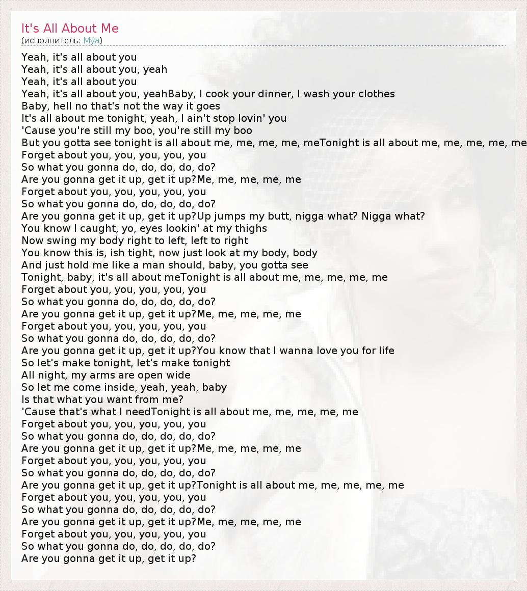 Yeah, it's all about you Yeah, it's all about you, yeah Yeah, it's all about you Yeah, it's all about you, yeahBaby, I cook your dinner, I wash your clothes Baby, hell no that's not the way it goes It's all about me tonight, yeah, I ain't stop lovin' you 'Cause you're still my boo, you're still my boo But you gotta see tonight is all about me, me, me, me, meTonight is all about me, me, me, me, me Forget about you, you, you, you, you So what you gonna do, do, do, do, do? Are you gonna get it up, get it up?Me, me, me, me, me Forget about you, you, you, you, you So what you gonna do, do, do, do, do? Are you gonna get it up, get it up?Up jumps my butt, nigga what? Nigga what? You know I caught, yo, eyes lookin' at my thighs Now swing my body right to left, left to right You know this is, ish tight, now just look at my body, body And just hold me like a man should, baby, you gotta see Tonight, baby, it's all about meTonight is all about me, me, me, me, me Forget about you, you, you, you, you So what you gonna do, do, do, do, do? Are you gonna get it up, get it up?Me, me, me, me, me Forget about you, you, you, you, you So what you gonna do, do, do, do, do? Are you gonna get it up, get it up?You know that I wanna love you for life So let's make tonight, let's make tonight All night, my arms are open wide So let me come inside, yeah, yeah, baby Is that what you want from me? 'Cause that's what I needTonight is all about me, me, me, me, me Forget about you, you, you, you, you So what you gonna do, do, do, do, do? Are you gonna get it up, get it up?Me, me, me, me, me Forget about you, you, you, you, you So what you gonna do, do, do, do, do? Are you gonna get it up, get it up?Tonight is all about me, me, me, me, me Forget about you, you, you, you, you So what you gonna do, do, do, do, do? Are you gonna get it up, get it up?Me, me, me, me, me Forget about you, you, you, you, you So what you gonna do, do, do, do, do? Are you gonna get it up, get it up?