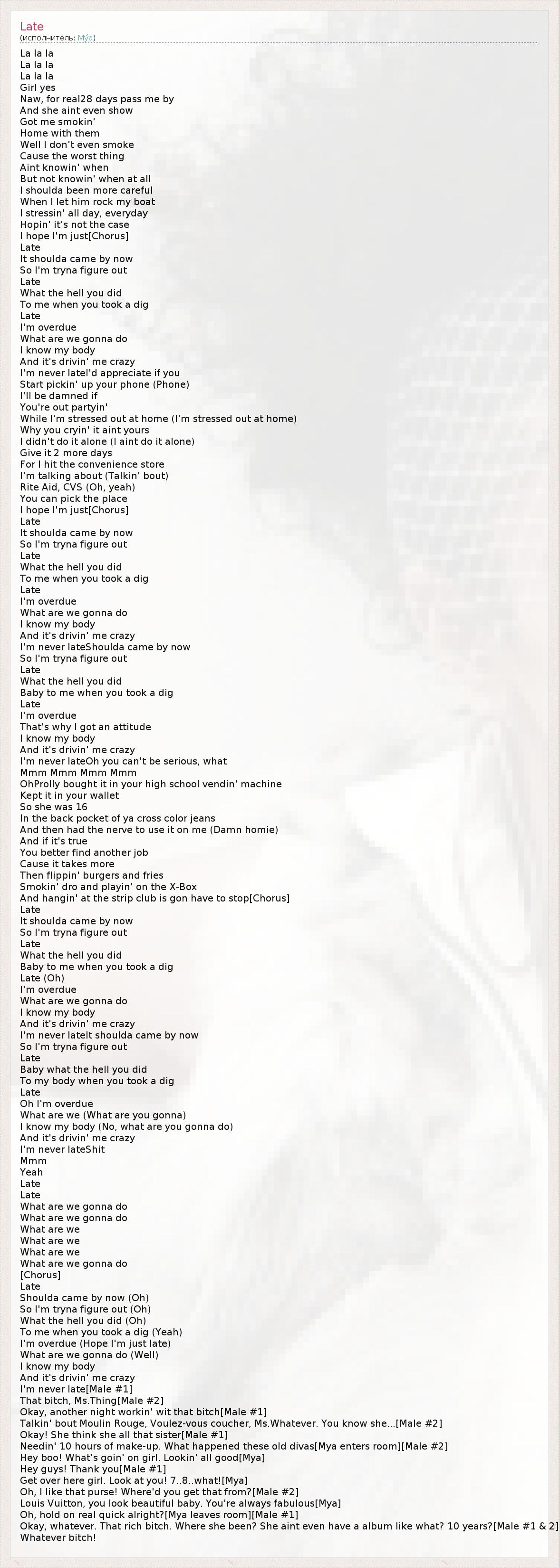 La la la La la la La la la Girl yes Naw, for real28 days pass me by And she aint even show Got me smokin' Home with them Well I don't even smoke Cause the worst thing Aint knowin' when But not knowin' when at all I shoulda been more careful When I let him rock my boat I stressin' all day, everyday Hopin' it's not the case I hope I'm just[Chorus] Late It shoulda came by now So I'm tryna figure out Late What the hell you did To me when you took a dig Late I'm overdue What are we gonna do I know my body And it's drivin' me crazy I'm never lateI'd appreciate if you Start pickin' up your phone (Phone) I'll be damned if You're out partyin' While I'm stressed out at home (I'm stressed out at home) Why you cryin' it aint yours I didn't do it alone (I aint do it alone) Give it 2 more days For I hit the convenience store I'm talking about (Talkin' bout) Rite Aid, CVS (Oh, yeah) You can pick the place I hope I'm just[Chorus] Late It shoulda came by now So I'm tryna figure out Late What the hell you did To me when you took a dig Late I'm overdue What are we gonna do I know my body And it's drivin' me crazy I'm never lateShoulda came by now So I'm tryna figure out Late What the hell you did Baby to me when you took a dig Late I'm overdue That's why I got an attitude I know my body And it's drivin' me crazy I'm never lateOh you can't be serious, what Mmm Mmm Mmm Mmm OhProlly bought it in your high school vendin' machine Kept it in your wallet So she was 16 In the back pocket of ya cross color jeans And then had the nerve to use it on me (Damn homie) And if it's true You better find another job Cause it takes more Then flippin' burgers and fries Smokin' dro and playin' on the X-Box And hangin' at the strip club is gon have to stop[Chorus] Late It shoulda came by now So I'm tryna figure out Late What the hell you did Baby to me when you took a dig Late (Oh) I'm overdue What are we gonna do I know my body And it's drivin' me crazy I'm never lateIt shoulda came by now So I'm tryna figure out Late Baby what the hell you did To my body when you took a dig Late Oh I'm overdue What are we (What are you gonna) I know my body (No, what are you gonna do) And it's drivin' me crazy I'm never lateShit Mmm Yeah Late Late What are we gonna do What are we gonna do What are we What are we What are we What are we gonna do [Chorus] Late Shoulda came by now (Oh) So I'm tryna figure out (Oh) What the hell you did (Oh) To me when you took a dig (Yeah) I'm overdue (Hope I'm just late) What are we gonna do (Well) I know my body And it's drivin' me crazy I'm never late[Male #1] That bitch, Ms.Thing[Male #2] Okay, another night workin' wit that bitch[Male #1] Talkin' bout Moulin Rouge, Voulez-vous coucher, Ms.Whatever. You know she...[Male #2] Okay! She think she all that sister[Male #1] Needin' 10 hours of make-up. What happened these old divas[Mya enters room][Male #2] Hey boo! What's goin' on girl. Lookin' all good[Mya] Hey guys! Thank you[Male #1] Get over here girl. Look at you! 7..8..what![Mya] Oh, I like that purse! Where'd you get that from?[Male #2] Louis Vuitton, you look beautiful baby. You're always fabulous[Mya] Oh, hold on real quick alright?[Mya leaves room][Male #1] Okay, whatever. That rich bitch. Where she been? She aint even have a album like what? 10 years?[Male #1 & 2] Whatever bitch!