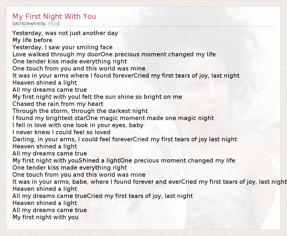 Yesterday, was not just another day My life before Yesterday, I saw your smiling face Love walked through my doorOne precious moment changed my life One tender kiss made everything right One touch from you and this world was mine It was in your arms where I found foreverCried my first tears of joy, last night Heaven shined a light All my dreams came true My first night with youI felt the sun shine so bright on me Chased the rain from my heart Through the storm, through the darkest night I found my brightest starOne magic moment made one magic night I fell in love with one look in your eyes, baby I never knew I could feel so loved Darling, in your arms, I could feel foreverCried my first tears of joy last night Heaven shined a light All my dreams came true My first night with youShined a lightOne precious moment changed my life One tender kiss made everything right One touch from you and this world was mine It was in your arms, babe, where I found forever and everCried my first tears of joy, last night Heaven shined a light All my dreams came trueCried my first tears of joy, last night Heaven shined a light All my dreams came true My first night with you
