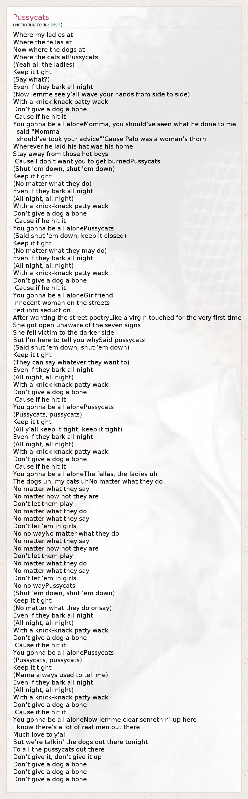 Where my ladies at Where the fellas at Now where the dogs at Where the cats atPussycats (Yeah all the ladies) Keep it tight (Say what?) Even if they bark all night (Now lemme see y'all wave your hands from side to side) With a knick knack patty wack Don't give a dog a bone 'Cause if he hit it You gonna be all aloneMomma, you should've seen what he done to me I said "Momma I should've took your advice"'Cause Palo was a woman's thorn Wherever he laid his hat was his home Stay away from those hot boys 'Cause I don't want you to get burnedPussycats (Shut 'em down, shut 'em down) Keep it tight (No matter what they do) Even if they bark all night (All night, all night) With a knick-knack patty wack Don't give a dog a bone 'Cause if he hit it You gonna be all alonePussycats (Said shut 'em down, keep it closed) Keep it tight (No matter what they may do) Even if they bark all night (All night, all night) With a knick-knack patty wack Don't give a dog a bone 'Cause if he hit it You gonna be all aloneGirlfriend Innocent woman on the streets Fed into seduction After wanting the street poetryLike a virgin touched for the very first time She got open unaware of the seven signs She fell victim to the darker side But I'm here to tell you whySaid pussycats (Said shut 'em down, shut 'em down) Keep it tight (They can say whatever they want to) Even if they bark all night (All night, all night) With a knick-knack patty wack Don't give a dog a bone 'Cause if he hit it You gonna be all alonePussycats (Pussycats, pussycats) Keep it tight (All y'all keep it tight, keep it tight) Even if they bark all night (All night, all night) With a knick-knack patty wack Don't give a dog a bone 'Cause if he hit it You gonna be all aloneThe fellas, the ladies uh The dogs uh, my cats uhNo matter what they do No matter what they say No matter how hot they are Don't let them play No matter what they do No matter what they say Don't let 'em in girls No no wayNo matter what they do No matter what they say No matter how hot they are Don't let them play No matter what they do No matter what they say Don't let 'em in girls No no wayPussycats (Shut 'em down, shut 'em down) Keep it tight (No matter what they do or say) Even if they bark all night (All night, all night) With a knick-knack patty wack Don't give a dog a bone 'Cause if he hit it You gonna be all alonePussycats (Pussycats, pussycats) Keep it tight (Mama always used to tell me) Even if they bark all night (All night, all night) With a knick-knack patty wack Don't give a dog a bone 'Cause if he hit it You gonna be all aloneNow lemme clear somethin' up here I know there's a lot of real men out there Much love to y'all But we're talkin' the dogs out there tonight To all the pussycats out there Don't give it, don't give it up Don't give a dog a bone Don't give a dog a bone Don't give a dog a bone