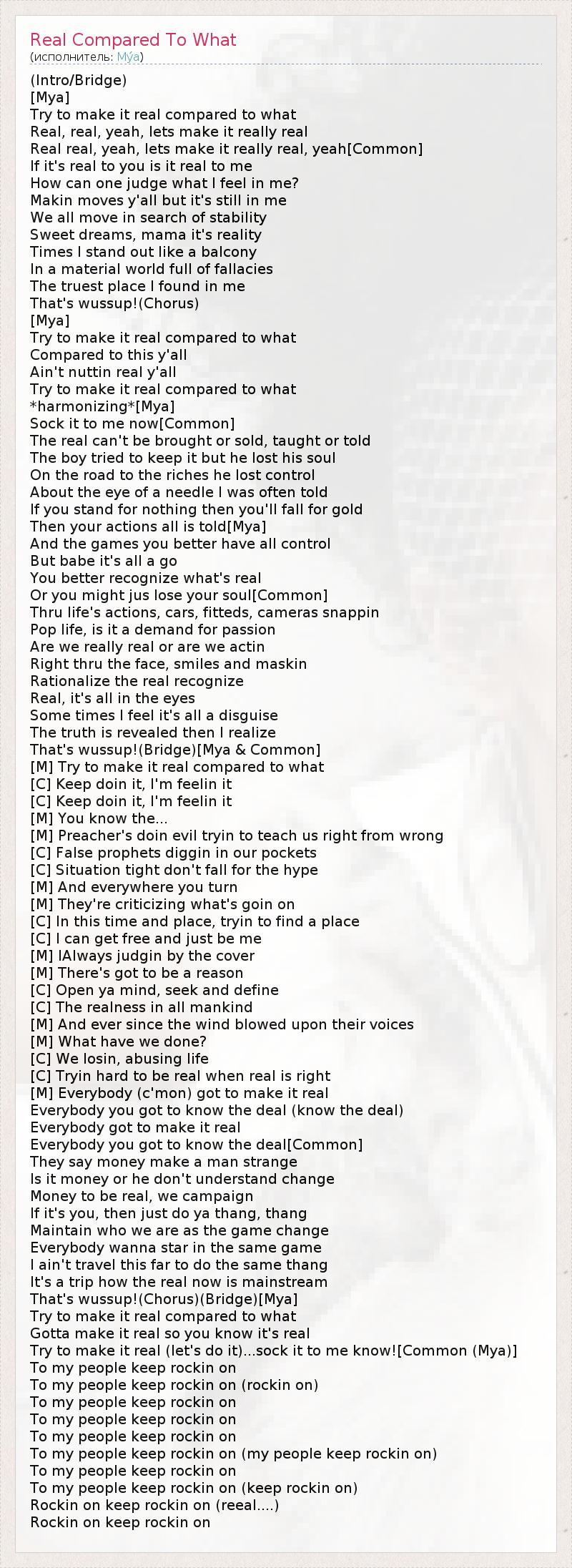 (Intro/Bridge) [Mya] Try to make it real compared to what Real, real, yeah, lets make it really real Real real, yeah, lets make it really real, yeah[Common] If it's real to you is it real to me How can one judge what I feel in me? Makin moves y'all but it's still in me We all move in search of stability Sweet dreams, mama it's reality Times I stand out like a balcony In a material world full of fallacies The truest place I found in me That's wussup!(Chorus) [Mya] Try to make it real compared to what Compared to this y'all Ain't nuttin real y'all Try to make it real compared to what *harmonizing*[Mya] Sock it to me now[Common] The real can't be brought or sold, taught or told The boy tried to keep it but he lost his soul On the road to the riches he lost control About the eye of a needle I was often told If you stand for nothing then you'll fall for gold Then your actions all is told[Mya] And the games you better have all control But babe it's all a go You better recognize what's real Or you might jus lose your soul[Common] Thru life's actions, cars, fitteds, cameras snappin Pop life, is it a demand for passion Are we really real or are we actin Right thru the face, smiles and maskin Rationalize the real recognize Real, it's all in the eyes Some times I feel it's all a disguise The truth is revealed then I realize That's wussup!(Bridge)[Mya & Common] [M] Try to make it real compared to what [C] Keep doin it, I'm feelin it [C] Keep doin it, I'm feelin it [M] You know the... [M] Preacher's doin evil tryin to teach us right from wrong [C] False prophets diggin in our pockets [C] Situation tight don't fall for the hype [M] And everywhere you turn [M] They're criticizing what's goin on [C] In this time and place, tryin to find a place [C] I can get free and just be me [M] IAlways judgin by the cover [M] There's got to be a reason [C] Open ya mind, seek and define [C] The realness in all mankind [M] And ever since the wind blowed upon their voices [M] What have we done? [C] We losin, abusing life [C] Tryin hard to be real when real is right [M] Everybody (c'mon) got to make it real Everybody you got to know the deal (know the deal) Everybody got to make it real Everybody you got to know the deal[Common] They say money make a man strange Is it money or he don't understand change Money to be real, we campaign If it's you, then just do ya thang, thang Maintain who we are as the game change Everybody wanna star in the same game I ain't travel this far to do the same thang It's a trip how the real now is mainstream That's wussup!(Chorus)(Bridge)[Mya] Try to make it real compared to what Gotta make it real so you know it's real Try to make it real (let's do it)...sock it to me know![Common (Mya)] To my people keep rockin on To my people keep rockin on (rockin on) To my people keep rockin on To my people keep rockin on To my people keep rockin on To my people keep rockin on (my people keep rockin on) To my people keep rockin on To my people keep rockin on (keep rockin on) Rockin on keep rockin on (reeal....) Rockin on keep rockin on