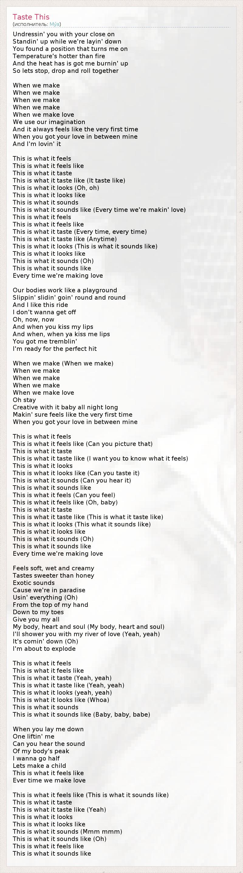 Undressin' you with your close on Standin' up while we're layin' down You found a position that turns me on Temperature's hotter than fire And the heat has is got me burnin' up So lets stop, drop and roll together When we make When we make When we make When we make When we make love We use our imagination And it always feels like the very first time When you got your love in between mine And I'm lovin' it This is what it feels This is what it feels like This is what it taste This is what it taste like (It taste like) This is what it looks (Oh, oh) This is what it looks like This is what it sounds This is what it sounds like (Every time we're makin' love) This is what it feels This is what it feels like This is what it taste (Every time, every time) This is what it taste like (Anytime) This is what it looks (This is what it sounds like) This is what it looks like This is what it sounds (Oh) This is what it sounds like Every time we're making love Our bodies work like a playground Slippin' slidin' goin' round and round And I like this ride I don't wanna get off Oh, now, now And when you kiss my lips And when, when ya kiss me lips You got me tremblin' I'm ready for the perfect hit When we make (When we make) When we make When we make When we make When we make love Oh stay Creative with it baby all night long Makin' sure feels like the very first time When you got your love in between mine This is what it feels This is what it feels like (Can you picture that) This is what it taste This is what it taste like (I want you to know what it feels) This is what it looks This is what it looks like (Can you taste it) This is what it sounds (Can you hear it) This is what it sounds like This is what it feels (Can you feel) This is what it feels like (Oh, baby) This is what it taste This is what it taste like (This is what it taste like) This is what it looks (This what it sounds like) This is what it looks like This is what it sounds (Oh) This is what it sounds like Every time we're making love Feels soft, wet and creamy Tastes sweeter than honey Exotic sounds Cause we're in paradise Usin' everything (Oh) From the top of my hand Down to my toes Give you my all My body, heart and soul (My body, heart and soul) I'll shower you with my river of love (Yeah, yeah) It's comin' down (Oh) I'm about to explode This is what it feels This is what it feels like This is what it taste (Yeah, yeah) This is what it taste like (Yeah, yeah) This is what it looks (yeah, yeah) This is what it looks like (Whoa) This is what it sounds This is what it sounds like (Baby, baby, babe) When you lay me down One liftin' me Can you hear the sound Of my body's peak I wanna go half Lets make a child This is what it feels like Ever time we make love This is what it feels like (This is what it sounds like) This is what it taste This is what it taste like (Yeah) This is what it looks This is what it looks like This is what it sounds (Mmm mmm) This is what it sounds like (Oh) This is what it feels like This is what it sounds like