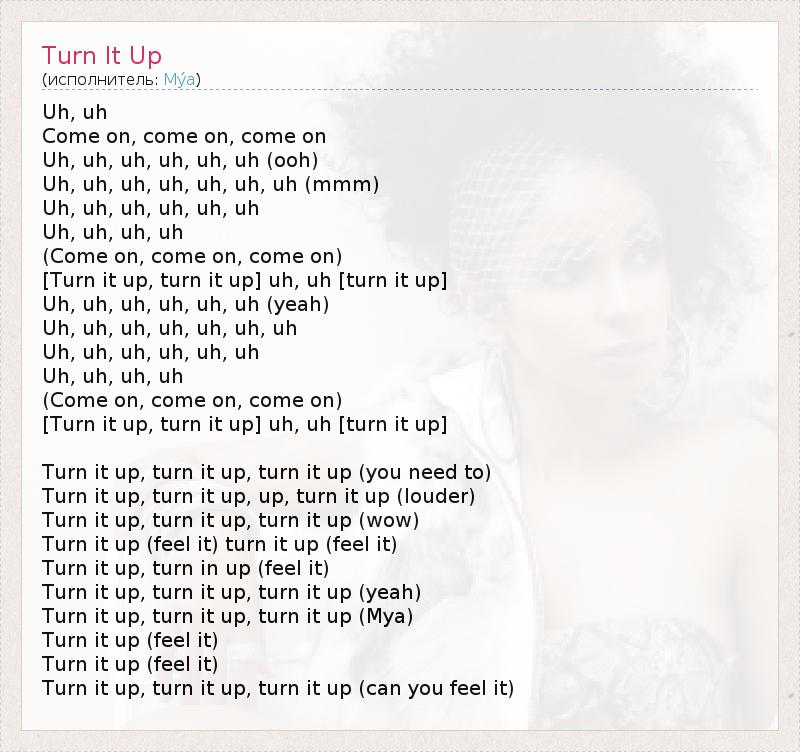 Uh, uh Come on, come on, come on Uh, uh, uh, uh, uh, uh (ooh) Uh, uh, uh, uh, uh, uh, uh (mmm) Uh, uh, uh, uh, uh, uh Uh, uh, uh, uh (Come on, come on, come on) [Turn it up, turn it up] uh, uh [turn it up] Uh, uh, uh, uh, uh, uh (yeah) Uh, uh, uh, uh, uh, uh, uh Uh, uh, uh, uh, uh, uh Uh, uh, uh, uh (Come on, come on, come on) [Turn it up, turn it up] uh, uh [turn it up] Turn it up, turn it up, turn it up (you need to) Turn it up, turn it up, up, turn it up (louder) Turn it up, turn it up, turn it up (wow) Turn it up (feel it) turn it up (feel it) Turn it up, turn in up (feel it) Turn it up, turn it up, turn it up (yeah) Turn it up, turn it up, turn it up (Mya) Turn it up (feel it) Turn it up (feel it) Turn it up, turn it up, turn it up (can you feel it)