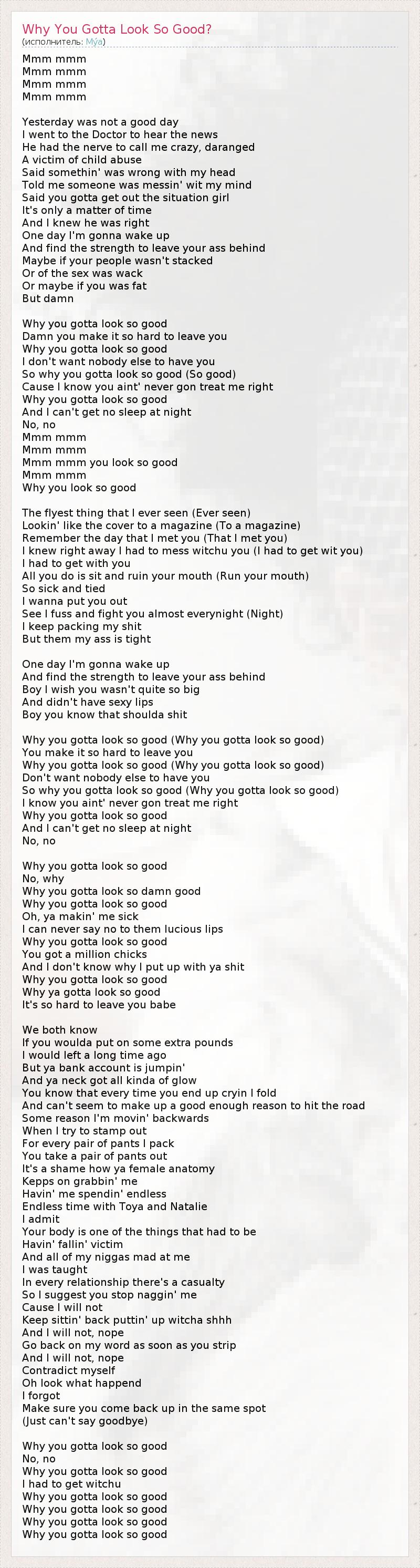 Mmm mmm Mmm mmm Mmm mmm Mmm mmm Yesterday was not a good day I went to the Doctor to hear the news He had the nerve to call me crazy, daranged A victim of child abuse Said somethin' was wrong with my head Told me someone was messin' wit my mind Said you gotta get out the situation girl It's only a matter of time And I knew he was right One day I'm gonna wake up And find the strength to leave your ass behind Maybe if your people wasn't stacked Or of the sex was wack Or maybe if you was fat But damn Why you gotta look so good Damn you make it so hard to leave you Why you gotta look so good I don't want nobody else to have you So why you gotta look so good (So good) Cause I know you aint' never gon treat me right Why you gotta look so good And I can't get no sleep at night No, no Mmm mmm Mmm mmm Mmm mmm you look so good Mmm mmm Why you look so good The flyest thing that I ever seen (Ever seen) Lookin' like the cover to a magazine (To a magazine) Remember the day that I met you (That I met you) I knew right away I had to mess witchu you (I had to get wit you) I had to get with you All you do is sit and ruin your mouth (Run your mouth) So sick and tied I wanna put you out See I fuss and fight you almost everynight (Night) I keep packing my shit But them my ass is tight One day I'm gonna wake up And find the strength to leave your ass behind Boy I wish you wasn't quite so big And didn't have sexy lips Boy you know that shoulda shit Why you gotta look so good (Why you gotta look so good) You make it so hard to leave you Why you gotta look so good (Why you gotta look so good) Don't want nobody else to have you So why you gotta look so good (Why you gotta look so good) I know you aint' never gon treat me right Why you gotta look so good And I can't get no sleep at night No, no Why you gotta look so good No, why Why you gotta look so damn good Why you gotta look so good Oh, ya makin' me sick I can never say no to them lucious lips Why you gotta look so good You got a million chicks And I don't know why I put up with ya shit Why you gotta look so good Why ya gotta look so good It's so hard to leave you babe We both know If you woulda put on some extra pounds I would left a long time ago But ya bank account is jumpin' And ya neck got all kinda of glow You know that every time you end up cryin I fold And can't seem to make up a good enough reason to hit the road Some reason I'm movin' backwards When I try to stamp out For every pair of pants I pack You take a pair of pants out It's a shame how ya female anatomy Kepps on grabbin' me Havin' me spendin' endless Endless time with Toya and Natalie I admit Your body is one of the things that had to be Havin' fallin' victim And all of my niggas mad at me I was taught In every relationship there's a casualty So I suggest you stop naggin' me Cause I will not Keep sittin' back puttin' up witcha shhh And I will not, nope Go back on my word as soon as you strip And I will not, nope Contradict myself Oh look what happend I forgot Make sure you come back up in the same spot (Just can't say goodbye) Why you gotta look so good No, no Why you gotta look so good I had to get witchu Why you gotta look so good Why you gotta look so good Why you gotta look so good Why you gotta look so good