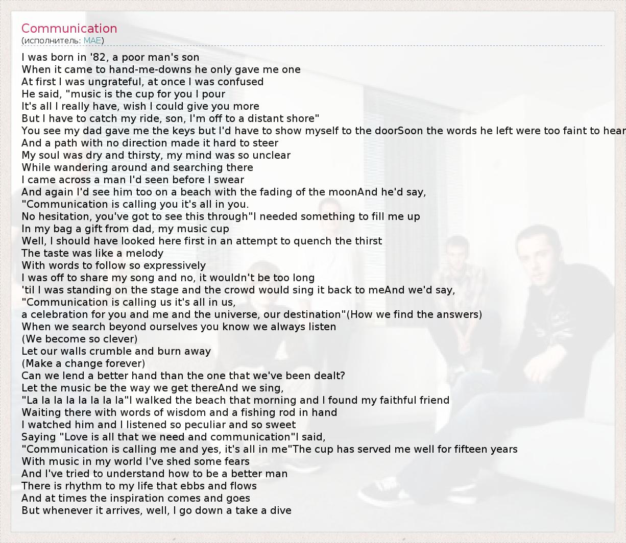 I was born in '82, a poor man's son When it came to hand-me-downs he only gave me one At first I was ungrateful, at once I was confused He said, "music is the cup for you I pour It's all I really have, wish I could give you more But I have to catch my ride, son, I'm off to a distant shore" You see my dad gave me the keys but I'd have to show myself to the doorSoon the words he left were too faint to hear And a path with no direction made it hard to steer My soul was dry and thirsty, my mind was so unclear While wandering around and searching there I came across a man I'd seen before I swear And again I'd see him too on a beach with the fading of the moonAnd he'd say, "Communication is calling you it's all in you. No hesitation, you've got to see this through"I needed something to fill me up In my bag a gift from dad, my music cup Well, I should have looked here first in an attempt to quench the thirst The taste was like a melody With words to follow so expressively I was off to share my song and no, it wouldn't be too long 'til I was standing on the stage and the crowd would sing it back to meAnd we'd say, "Communication is calling us it's all in us, a celebration for you and me and the universe, our destination"(How we find the answers) When we search beyond ourselves you know we always listen (We become so clever) Let our walls crumble and burn away (Make a change forever) Can we lend a better hand than the one that we've been dealt? Let the music be the way we get thereAnd we sing, "La la la la la la la la"I walked the beach that morning and I found my faithful friend Waiting there with words of wisdom and a fishing rod in hand I watched him and I listened so peculiar and so sweet Saying "Love is all that we need and communication"I said, "Communication is calling me and yes, it's all in me"The cup has served me well for fifteen years With music in my world I've shed some fears And I've tried to understand how to be a better man There is rhythm to my life that ebbs and flows And at times the inspiration comes and goes But whenever it arrives, well, I go down a take a dive