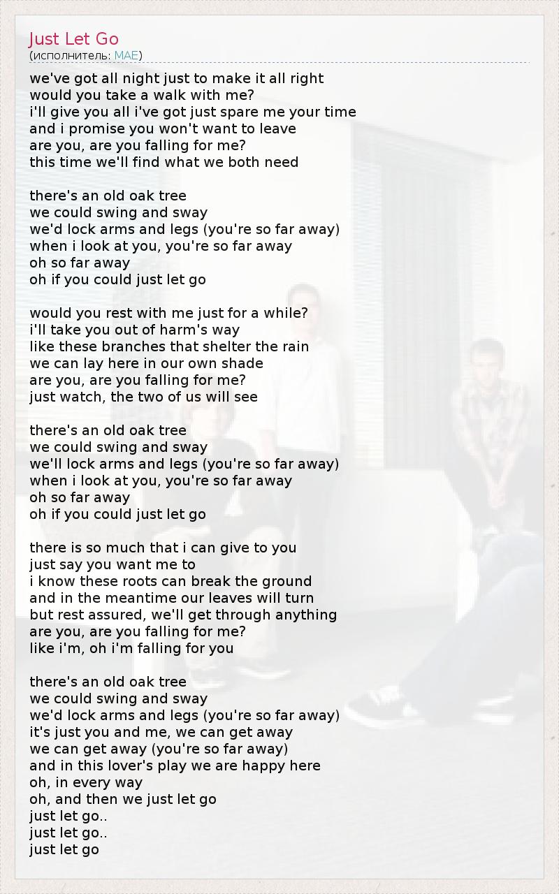 we've got all night just to make it all right would you take a walk with me? i'll give you all i've got just spare me your time and i promise you won't want to leave are you, are you falling for me? this time we'll find what we both need there's an old oak tree we could swing and sway we'd lock arms and legs (you're so far away) when i look at you, you're so far away oh so far away oh if you could just let go would you rest with me just for a while? i'll take you out of harm's way like these branches that shelter the rain we can lay here in our own shade are you, are you falling for me? just watch, the two of us will see there's an old oak tree we could swing and sway we'll lock arms and legs (you're so far away) when i look at you, you're so far away oh so far away oh if you could just let go there is so much that i can give to you just say you want me to i know these roots can break the ground and in the meantime our leaves will turn but rest assured, we'll get through anything are you, are you falling for me? like i'm, oh i'm falling for you there's an old oak tree we could swing and sway we'd lock arms and legs (you're so far away) it's just you and me, we can get away we can get away (you're so far away) and in this lover's play we are happy here oh, in every way oh, and then we just let go just let go.. just let go.. just let go