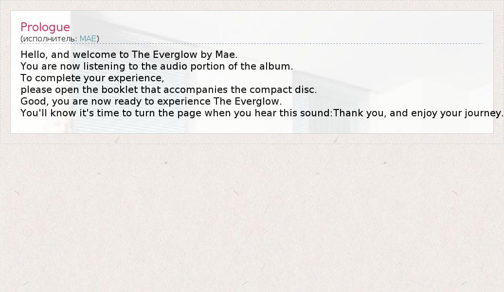 Hello, and welcome to The Everglow by Mae. You are now listening to the audio portion of the album. To complete your experience, please open the booklet that accompanies the compact disc. Good, you are now ready to experience The Everglow. You'll know it's time to turn the page when you hear this sound:Thank you, and enjoy your journey.