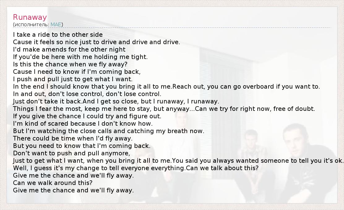 I take a ride to the other side Cause it feels so nice just to drive and drive and drive. I'd make amends for the other night If you'de be here with me holding me tight. Is this the chance when we fly away? Cause I need to know if I'm coming back, I push and pull just to get what I want. In the end I should know that you bring it all to me.Reach out, you can go overboard if you want to. In and out, don't lose control, don't lose control. Just don't take it back.And I get so close, but I runaway, I runaway. Things I fear the most, keep me here to stay, but anyway...Can we try for right now, free of doubt. If you give the chance I could try and figure out. I'm kind of scared because I don't know how. But I'm watching the close calls and catching my breath now. There could be time when I'd fly away. But you need to know that I'm coming back. Don't want to push and pull anymore, Just to get what I want, when you bring it all to me.You said you always wanted someone to tell you it's ok. Well, I guess it's my change to tell everyone everything.Can we talk about this? Give me the chance and we'll fly away. Can we walk around this? Give me the chance and we'll fly away.