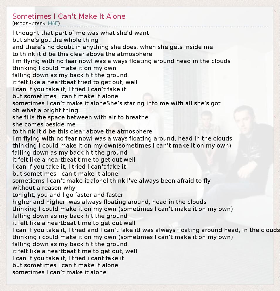 I thought that part of me was what she'd want but she's got the whole thing and there's no doubt in anything she does, when she gets inside me to think it'd be this clear above the atmosphere I'm flying with no fear nowI was always floating around head in the clouds thinking I could make it on my own falling down as my back hit the ground it felt like a heartbeat tried to get out, well I can if you take it, I tried I can't fake it but sometimes I can't make it alone sometimes I can't make it aloneShe's staring into me with all she's got oh what a bright thing she fills the space between with air to breathe she comes beside me to think it'd be this clear above the atmosphere I'm flying with no fear nowI was always floating around, head in the clouds thinking I could make it on my own(sometimes I can't make it on my own) falling down as my back hit the ground it felt like a heartbeat time to get out well I can if you take it, I tried I can't fake it but sometimes I can't make it alone sometiems I can't make it aloneI think I've always been afraid to fly without a reason why tonight, you and I go faster and faster higher and higherI was always floating around, head in the clouds thinking I could make it on my own (sometimes I can't make it on my own) falling down as my back hit the ground it felt like a heartbeat time to get out well I can if you take it, I tried and I can't fake itI was always floating around head, in the clouds thinking i could make it on my own (sometimes I can't make it on my own) falling down as my back hit the ground it felt like a heartbeat time to get out, well I can if you take it, I tried i cant fake it but sometimes I can't make it alone sometimes I can't make it alone