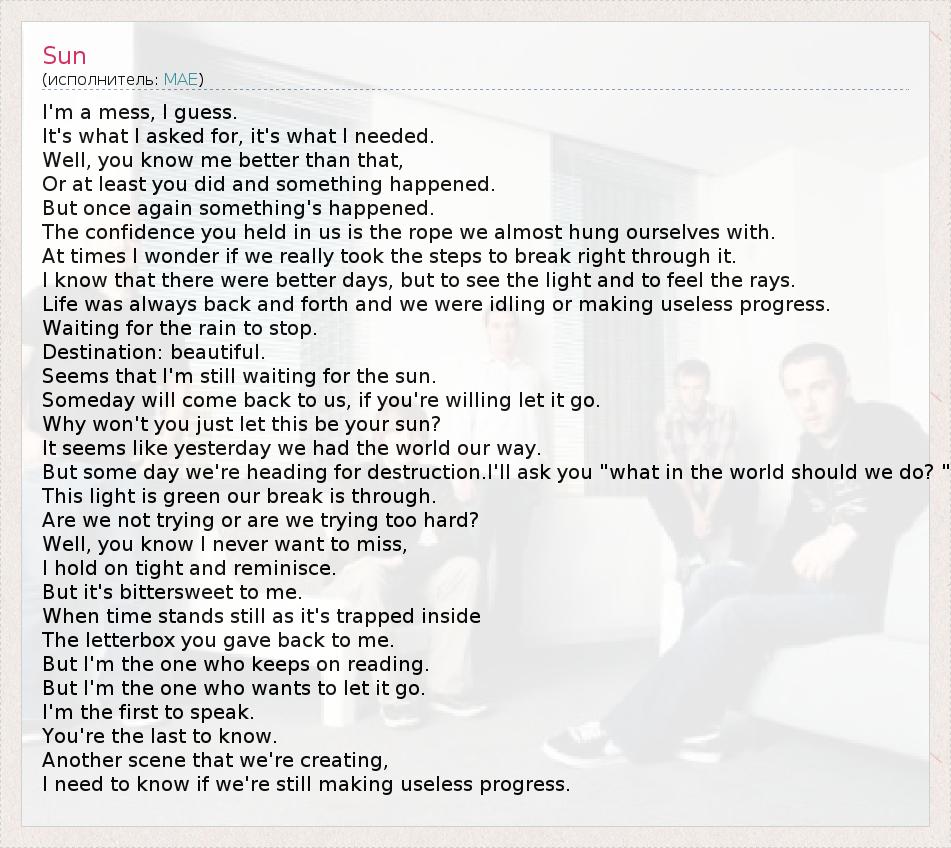I'm a mess, I guess. It's what I asked for, it's what I needed. Well, you know me better than that, Or at least you did and something happened. But once again something's happened. The confidence you held in us is the rope we almost hung ourselves with. At times I wonder if we really took the steps to break right through it. I know that there were better days, but to see the light and to feel the rays. Life was always back and forth and we were idling or making useless progress. Waiting for the rain to stop. Destination: beautiful. Seems that I'm still waiting for the sun. Someday will come back to us, if you're willing let it go. Why won't you just let this be your sun? It seems like yesterday we had the world our way. But some day we're heading for destruction.I'll ask you "what in the world should we do? " This light is green our break is through. Are we not trying or are we trying too hard? Well, you know I never want to miss, I hold on tight and reminisce. But it's bittersweet to me. When time stands still as it's trapped inside The letterbox you gave back to me. But I'm the one who keeps on reading. But I'm the one who wants to let it go. I'm the first to speak. You're the last to know. Another scene that we're creating, I need to know if we're still making useless progress.