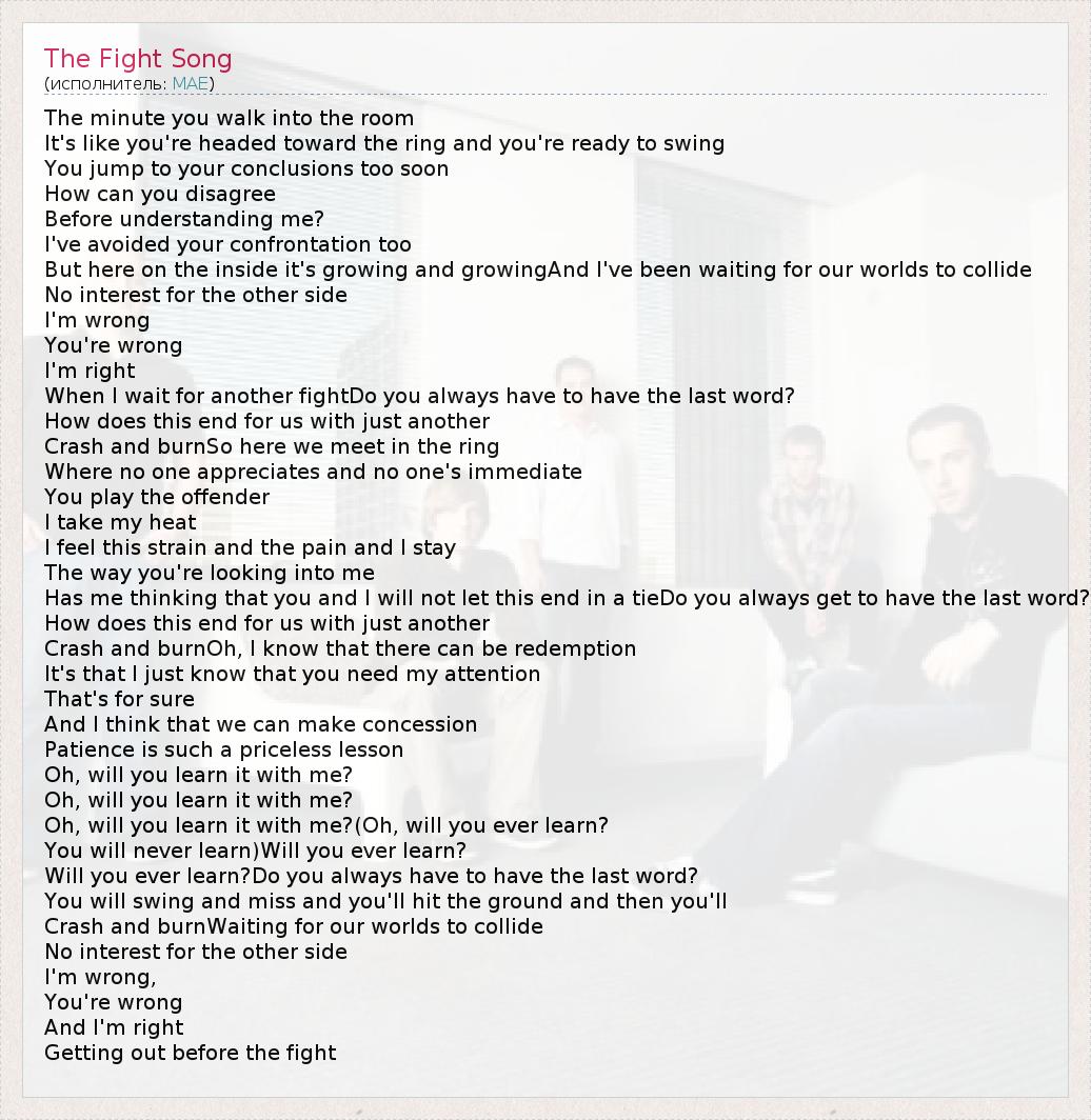 The minute you walk into the room It's like you're headed toward the ring and you're ready to swing You jump to your conclusions too soon How can you disagree Before understanding me? I've avoided your confrontation too But here on the inside it's growing and growingAnd I've been waiting for our worlds to collide No interest for the other side I'm wrong You're wrong I'm right When I wait for another fightDo you always have to have the last word? How does this end for us with just another Crash and burnSo here we meet in the ring Where no one appreciates and no one's immediate You play the offender I take my heat I feel this strain and the pain and I stay The way you're looking into me Has me thinking that you and I will not let this end in a tieDo you always get to have the last word? How does this end for us with just another Crash and burnOh, I know that there can be redemption It's that I just know that you need my attention That's for sure And I think that we can make concession Patience is such a priceless lesson Oh, will you learn it with me? Oh, will you learn it with me? Oh, will you learn it with me?(Oh, will you ever learn? You will never learn)Will you ever learn? Will you ever learn?Do you always have to have the last word? You will swing and miss and you'll hit the ground and then you'll Crash and burnWaiting for our worlds to collide No interest for the other side I'm wrong, You're wrong And I'm right Getting out before the fight