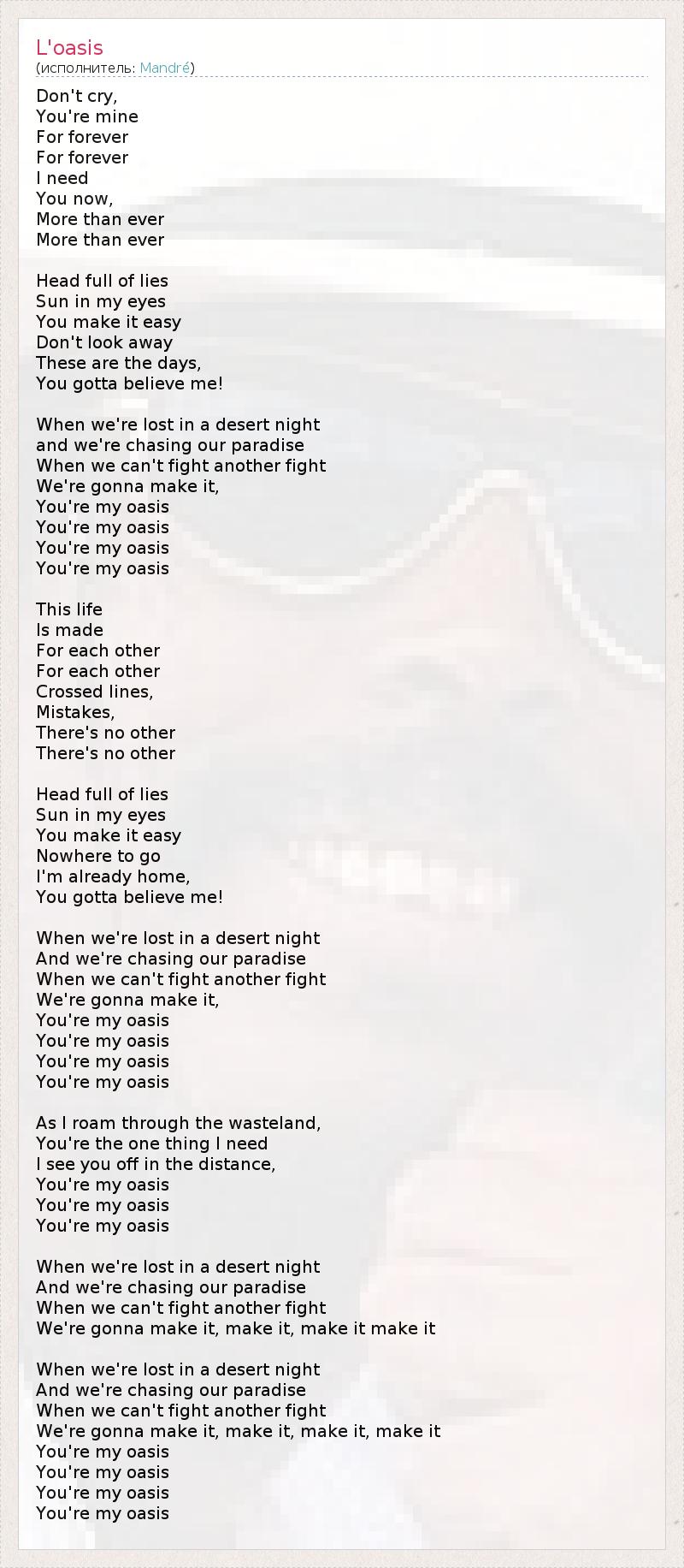 Не плачь. Ты моя Навсегда, Навсегда. Ты нужна мне Сейчас Больше, чем когда-либо, Больше, чем когда-либо. Моя голова полна лжи, Но ты зажгла огонь в моих глазах, И теперь всё стало так просто. Не отворачивайся от меня. Это те дни, Когда ты должна верить мне. Если мы заблудились в кромешной тьме И пытаемся найти рай для нас двоих, Если мы не в силах сражаться в очередном бою, Мы справимся со всем этим. Ты – мой оазис. Ты – мой оазис. Ты – мой оазис. Ты – мой оазис. Эта жизнь Создана Для нас двоих, Для нас двоих. Выход за рамки... Ошибки... По-другому и быть не может, Другого пути нет. Моя голова полна лжи, Но ты зажгла огонь в моих глазах, И теперь всё стало так просто. Не надо никуда идти, Я уже обрёл свой дом. Ты должна верить мне! Если мы заблудились в кромешной тьме И пытаемся найти рай для нас двоих, Если мы не в силах сражаться в очередном бою, Мы справимся со всем этим. Ты – мой оазис. Ты – мой оазис. Ты – мой оазис. Ты – мой оазис. Когда я скитаюсь по пустоши, Ты – единственное, что мне нужно. Я вижу тебя вдалеке. Ты – мой оазис. Ты – мой оазис. Ты – мой оазис. Если мы заблудились в кромешной тьме И пытаемся найти рай для нас двоих, Если мы не в силах сражаться в очередном бою, Мы справимся со всем этим, справимся, справимся, справимся! Если мы заблудились в кромешной тьме И пытаемся найти рай для нас двоих, Если мы не в силах сражаться в очередном бою, Мы справимся со всем этим, справимся, справимся, справимся! Ты – мой оазис. Ты – мой оазис. Ты – мой оазис. Ты – мой оазис.