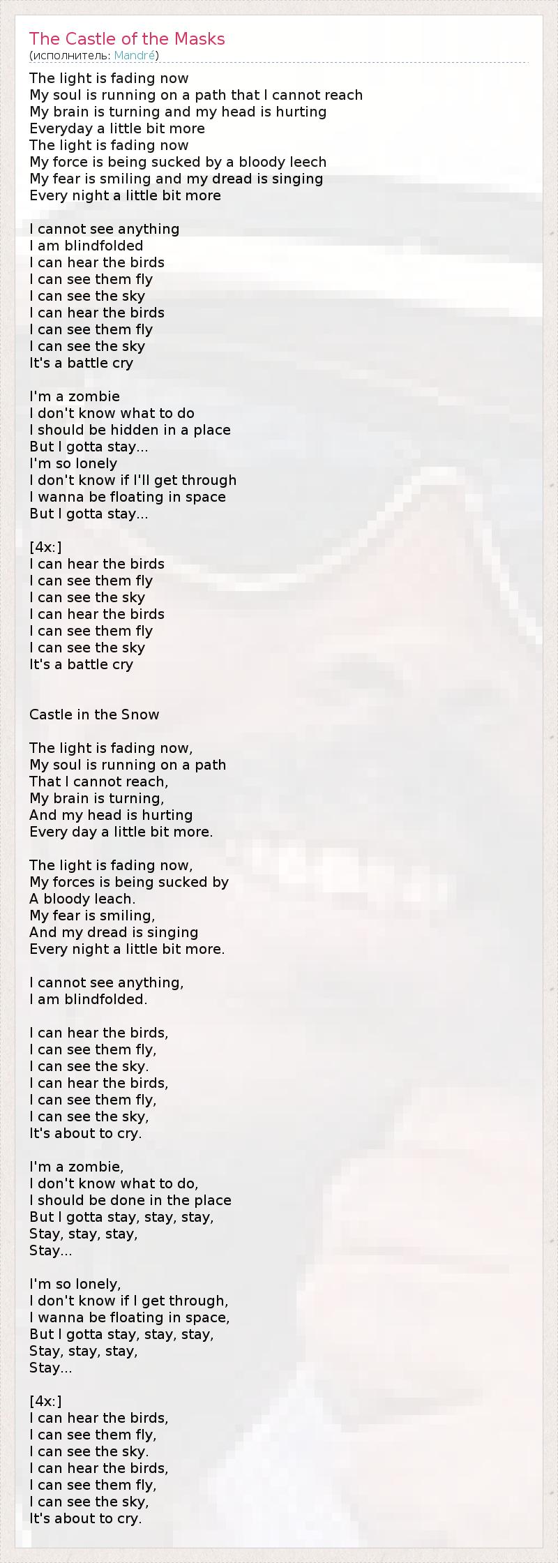 Свет медленно угасает, Моя душа тянется по недосягаемой тропе. Мысли кружатся вихрем, и голова болит С каждым днём немного сильнее. Свет медленно угасает, Мои силы вытягивает проклятая пиявка, Мой страх улыбается, а мой ужас поет С каждой ночью немного громче. Я ничего не вижу, У меня завязаны глаза. Я слышу птиц, Я смотрю, как они летят, Я вижу небо. Я слышу птиц, Я смотрю, как они летят, Я вижу небо. Это боевой клич. Я зомби, Я не знаю, что мне делать, Мне нужно где-то спрятаться, Но я должна остаться. Мне так одиноко, Не знаю, выдержу ли я, Я хочу плыть в космосе, Но я должна остаться. [4x:] Я слышу птиц, Я смотрю, как они летят, Я вижу небо. Я слышу птиц, Я смотрю, как они летят, Я вижу небо. Это боевой клич. Замок в снегу (перевод VeeWai) Сейчас свет меркнет, Моя душа тянется по тропе, До которой мне не достать. Мысли вьются вихрем, И голова болит Чуть сильнее с каждым днём. Сейчас свет меркнет, Мои силы высасывает Проклятая пиявка. Мой страх улыбается, А мой ужас поёт Чуть громче с каждой ночью. Я ничего не вижу, Я ослеплён. Я слышу птиц, Я вижу их полёт, Я вижу небо. Я слышу птиц, Я вижу их полёт, Я вижу небо, Оно вот-вот заплачет. Я зомби, Я не знаю, что делать, Мне нужно было закончить свои дела здесь, Но придётся остаться, остаться, остаться, Остаться, остаться, остаться, Остаться... Мне так одиноко, Не знаю, прорвусь ли я, Я хочу парить в пустоте, Но придётся остаться, остаться, остаться, Остаться, остаться, остаться, Остаться... [4x:] Я слышу птиц, Я вижу их полёт, Я вижу небо. Я слышу птиц, Я вижу их полёт, Я вижу небо, Оно вот-вот заплачет.