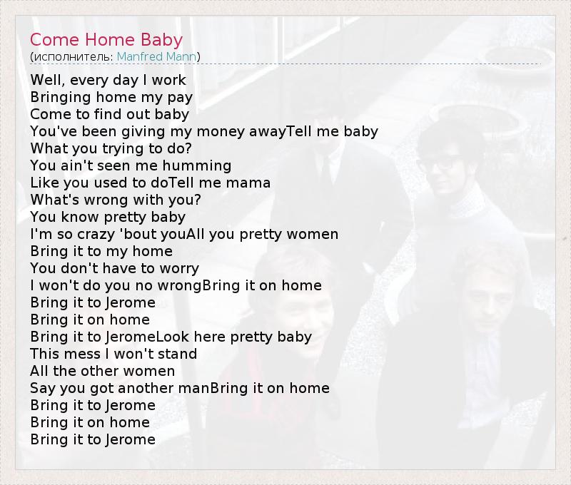 Well, every day I work Bringing home my pay Come to find out baby You've been giving my money awayTell me baby What you trying to do? You ain't seen me humming Like you used to doTell me mama What's wrong with you? You know pretty baby I'm so crazy 'bout youAll you pretty women Bring it to my home You don't have to worry I won't do you no wrongBring it on home Bring it to Jerome Bring it on home Bring it to JeromeLook here pretty baby This mess I won't stand All the other women Say you got another manBring it on home Bring it to Jerome Bring it on home Bring it to Jerome