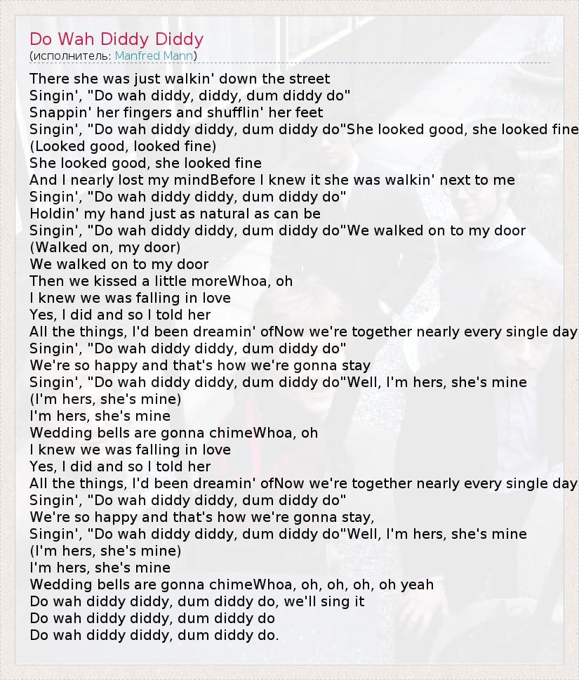 There she was just walkin' down the street Singin', "Do wah diddy, diddy, dum diddy do" Snappin' her fingers and shufflin' her feet Singin', "Do wah diddy diddy, dum diddy do"She looked good, she looked fine (Looked good, looked fine) She looked good, she looked fine And I nearly lost my mindBefore I knew it she was walkin' next to me Singin', "Do wah diddy diddy, dum diddy do" Holdin' my hand just as natural as can be Singin', "Do wah diddy diddy, dum diddy do"We walked on to my door (Walked on, my door) We walked on to my door Then we kissed a little moreWhoa, oh I knew we was falling in love Yes, I did and so I told her All the things, I'd been dreamin' ofNow we're together nearly every single day Singin', "Do wah diddy diddy, dum diddy do" We're so happy and that's how we're gonna stay Singin', "Do wah diddy diddy, dum diddy do"Well, I'm hers, she's mine (I'm hers, she's mine) I'm hers, she's mine Wedding bells are gonna chimeWhoa, oh I knew we was falling in love Yes, I did and so I told her All the things, I'd been dreamin' ofNow we're together nearly every single day Singin', "Do wah diddy diddy, dum diddy do" We're so happy and that's how we're gonna stay, Singin', "Do wah diddy diddy, dum diddy do"Well, I'm hers, she's mine (I'm hers, she's mine) I'm hers, she's mine Wedding bells are gonna chimeWhoa, oh, oh, oh, oh yeah Do wah diddy diddy, dum diddy do, we'll sing it Do wah diddy diddy, dum diddy do Do wah diddy diddy, dum diddy do.