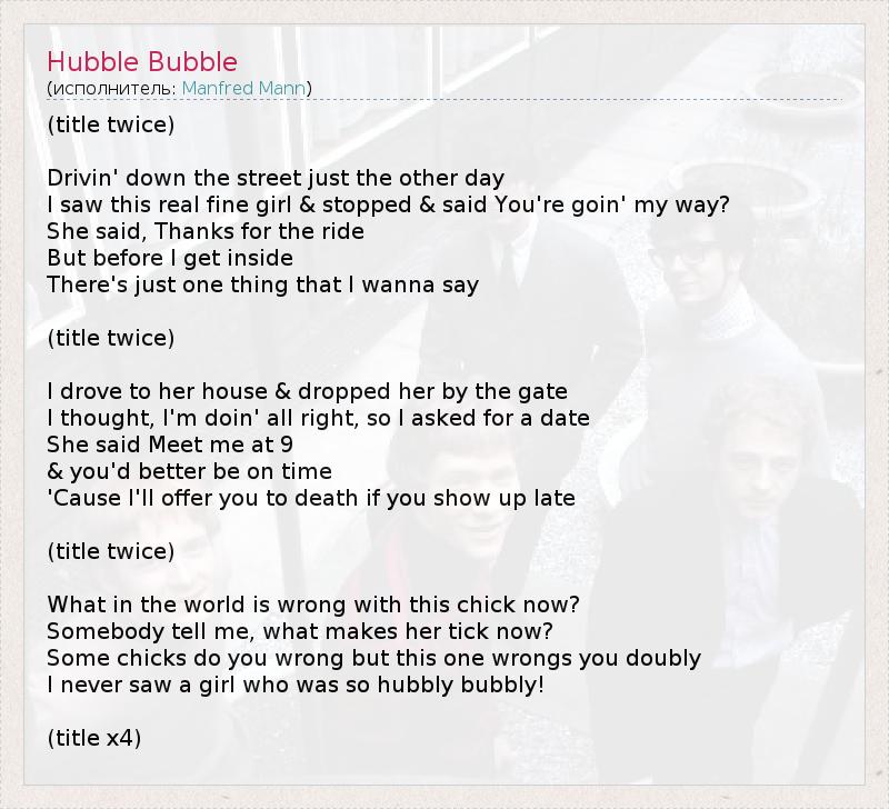 (title twice) Drivin' down the street just the other day I saw this real fine girl & stopped & said You're goin' my way? She said, Thanks for the ride But before I get inside There's just one thing that I wanna say (title twice) I drove to her house & dropped her by the gate I thought, I'm doin' all right, so I asked for a date She said Meet me at 9 & you'd better be on time 'Cause I'll offer you to death if you show up late (title twice) What in the world is wrong with this chick now? Somebody tell me, what makes her tick now? Some chicks do you wrong but this one wrongs you doubly I never saw a girl who was so hubbly bubbly! (title x4)