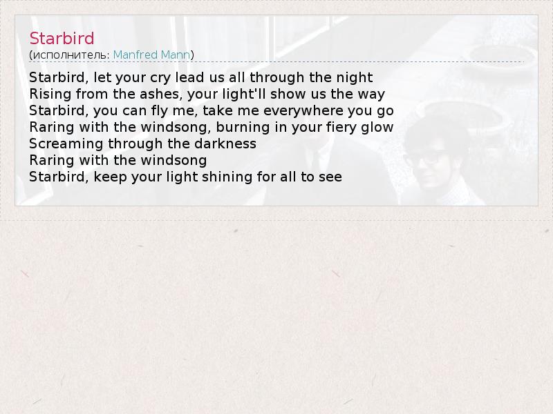Starbird, let your cry lead us all through the night Rising from the ashes, your light'll show us the way Starbird, you can fly me, take me everywhere you go Raring with the windsong, burning in your fiery glow Screaming through the darkness Raring with the windsong Starbird, keep your light shining for all to see