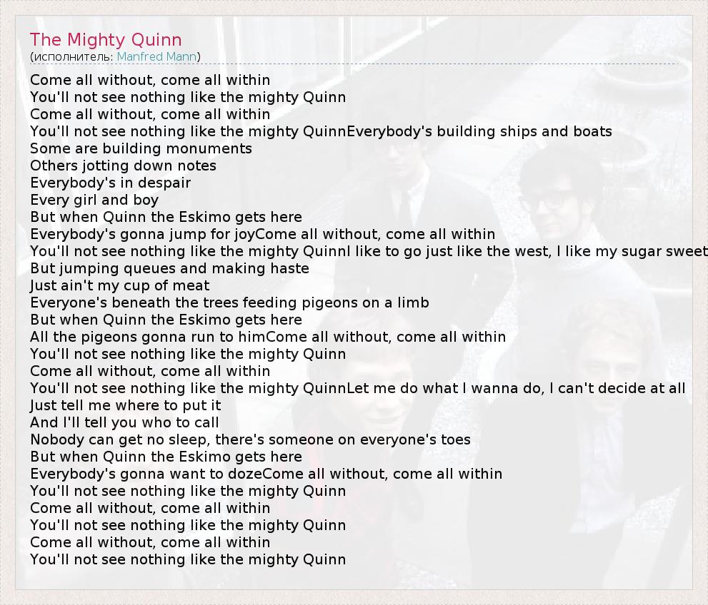 Come all without, come all within You'll not see nothing like the mighty Quinn Come all without, come all within You'll not see nothing like the mighty QuinnEverybody's building ships and boats Some are building monuments Others jotting down notes Everybody's in despair Every girl and boy But when Quinn the Eskimo gets here Everybody's gonna jump for joyCome all without, come all within You'll not see nothing like the mighty QuinnI like to go just like the west, I like my sugar sweet But jumping queues and making haste Just ain't my cup of meat Everyone's beneath the trees feeding pigeons on a limb But when Quinn the Eskimo gets here All the pigeons gonna run to himCome all without, come all within You'll not see nothing like the mighty Quinn Come all without, come all within You'll not see nothing like the mighty QuinnLet me do what I wanna do, I can't decide at all Just tell me where to put it And I'll tell you who to call Nobody can get no sleep, there's someone on everyone's toes But when Quinn the Eskimo gets here Everybody's gonna want to dozeCome all without, come all within You'll not see nothing like the mighty Quinn Come all without, come all within You'll not see nothing like the mighty Quinn Come all without, come all within You'll not see nothing like the mighty Quinn
