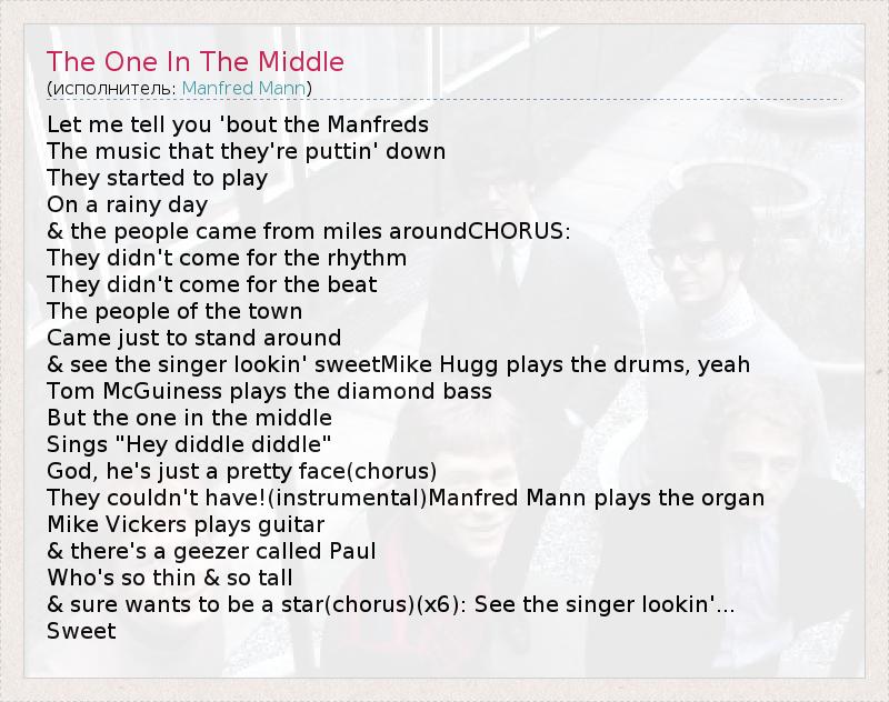 Let me tell you 'bout the Manfreds The music that they're puttin' down They started to play On a rainy day & the people came from miles aroundCHORUS: They didn't come for the rhythm They didn't come for the beat The people of the town Came just to stand around & see the singer lookin' sweetMike Hugg plays the drums, yeah Tom McGuiness plays the diamond bass But the one in the middle Sings "Hey diddle diddle" God, he's just a pretty face(chorus) They couldn't have!(instrumental)Manfred Mann plays the organ Mike Vickers plays guitar & there's a geezer called Paul Who's so thin & so tall & sure wants to be a star(chorus)(x6): See the singer lookin'... Sweet