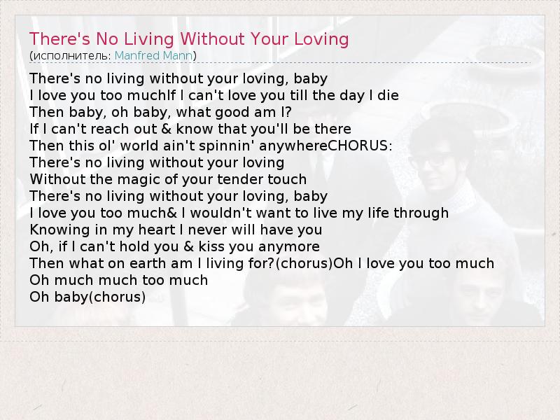 There's no living without your loving, baby I love you too muchIf I can't love you till the day I die Then baby, oh baby, what good am I? If I can't reach out & know that you'll be there Then this ol' world ain't spinnin' anywhereCHORUS: There's no living without your loving Without the magic of your tender touch There's no living without your loving, baby I love you too much& I wouldn't want to live my life through Knowing in my heart I never will have you Oh, if I can't hold you & kiss you anymore Then what on earth am I living for?(chorus)Oh I love you too much Oh much much too much Oh baby(chorus)