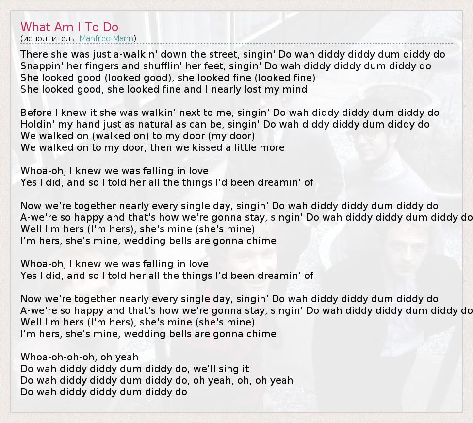There she was just a-walkin' down the street, singin' Do wah diddy diddy dum diddy do Snappin' her fingers and shufflin' her feet, singin' Do wah diddy diddy dum diddy do She looked good (looked good), she looked fine (looked fine) She looked good, she looked fine and I nearly lost my mind Before I knew it she was walkin' next to me, singin' Do wah diddy diddy dum diddy do Holdin' my hand just as natural as can be, singin' Do wah diddy diddy dum diddy do We walked on (walked on) to my door (my door) We walked on to my door, then we kissed a little more Whoa-oh, I knew we was falling in love Yes I did, and so I told her all the things I'd been dreamin' of Now we're together nearly every single day, singin' Do wah diddy diddy dum diddy do A-we're so happy and that's how we're gonna stay, singin' Do wah diddy diddy dum diddy do Well I'm hers (I'm hers), she's mine (she's mine) I'm hers, she's mine, wedding bells are gonna chime Whoa-oh, I knew we was falling in love Yes I did, and so I told her all the things I'd been dreamin' of Now we're together nearly every single day, singin' Do wah diddy diddy dum diddy do A-we're so happy and that's how we're gonna stay, singin' Do wah diddy diddy dum diddy do Well I'm hers (I'm hers), she's mine (she's mine) I'm hers, she's mine, wedding bells are gonna chime Whoa-oh-oh-oh, oh yeah Do wah diddy diddy dum diddy do, we'll sing it Do wah diddy diddy dum diddy do, oh yeah, oh, oh yeah Do wah diddy diddy dum diddy do