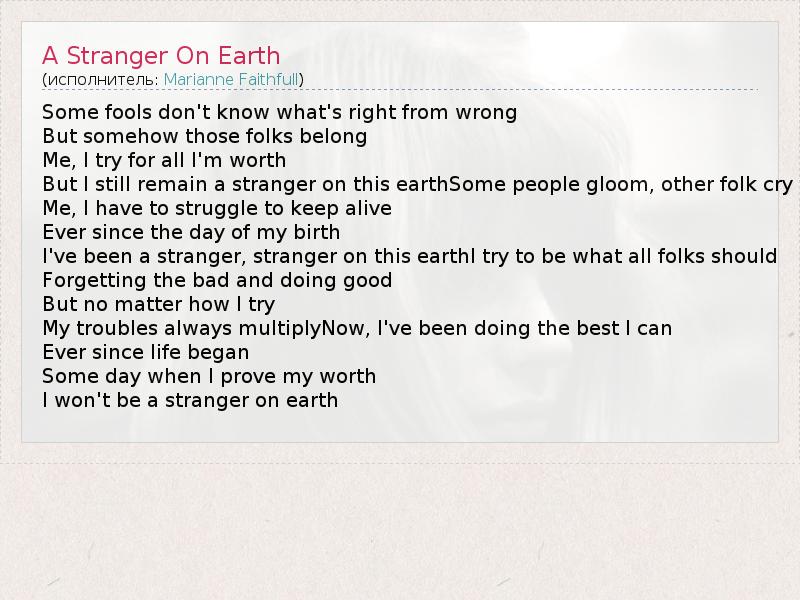 А как ты думаешь, о чем песня "A Stranger On Earth" ?