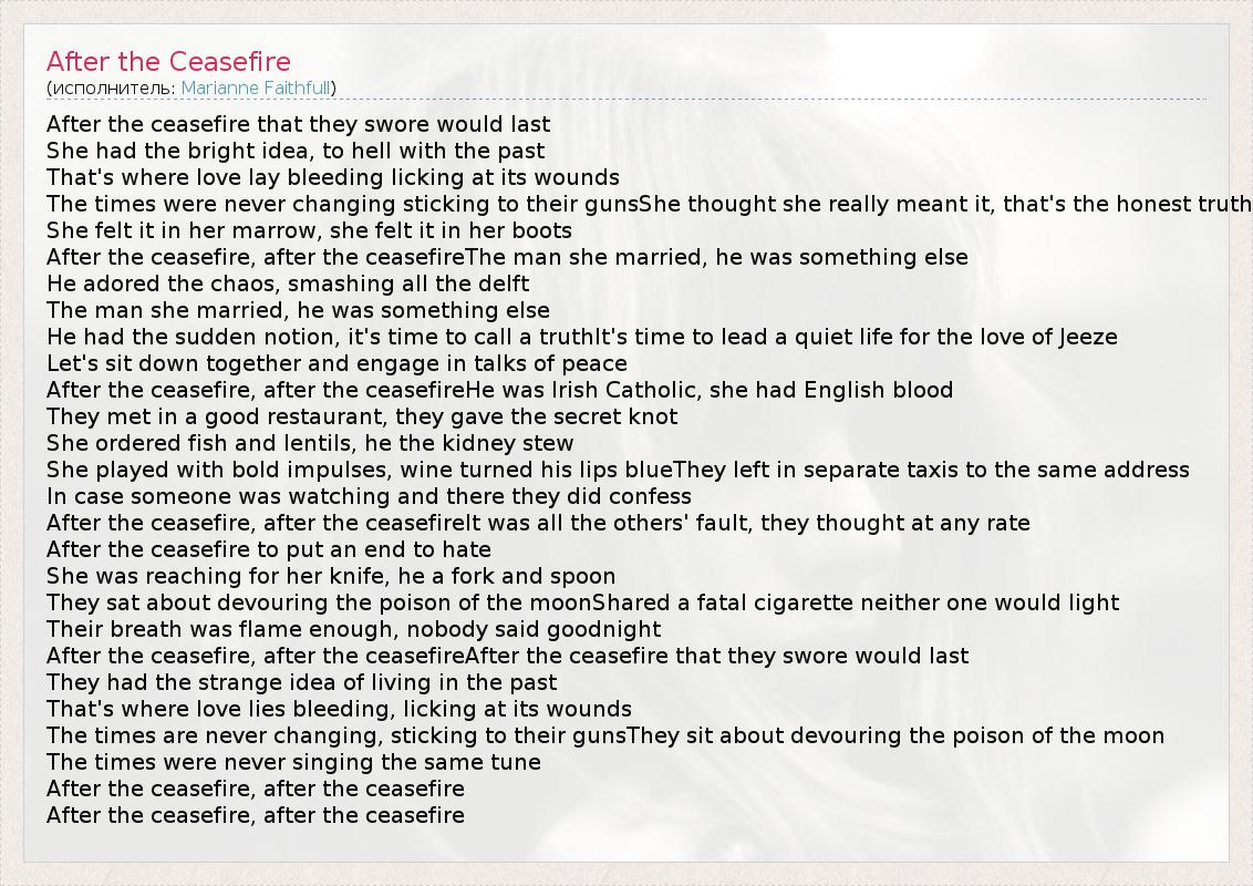 After the ceasefire that they swore would last She had the bright idea, to hell with the past That's where love lay bleeding licking at its wounds The times were never changing sticking to their gunsShe thought she really meant it, that's the honest truth She felt it in her marrow, she felt it in her boots After the ceasefire, after the ceasefireThe man she married, he was something else He adored the chaos, smashing all the delft The man she married, he was something else He had the sudden notion, it's time to call a truthIt's time to lead a quiet life for the love of Jeeze Let's sit down together and engage in talks of peace After the ceasefire, after the ceasefireHe was Irish Catholic, she had English blood They met in a good restaurant, they gave the secret knot She ordered fish and lentils, he the kidney stew She played with bold impulses, wine turned his lips blueThey left in separate taxis to the same address In case someone was watching and there they did confess After the ceasefire, after the ceasefireIt was all the others' fault, they thought at any rate After the ceasefire to put an end to hate She was reaching for her knife, he a fork and spoon They sat about devouring the poison of the moonShared a fatal cigarette neither one would light Their breath was flame enough, nobody said goodnight After the ceasefire, after the ceasefireAfter the ceasefire that they swore would last They had the strange idea of living in the past That's where love lies bleeding, licking at its wounds The times are never changing, sticking to their gunsThey sit about devouring the poison of the moon The times were never singing the same tune After the ceasefire, after the ceasefire After the ceasefire, after the ceasefire