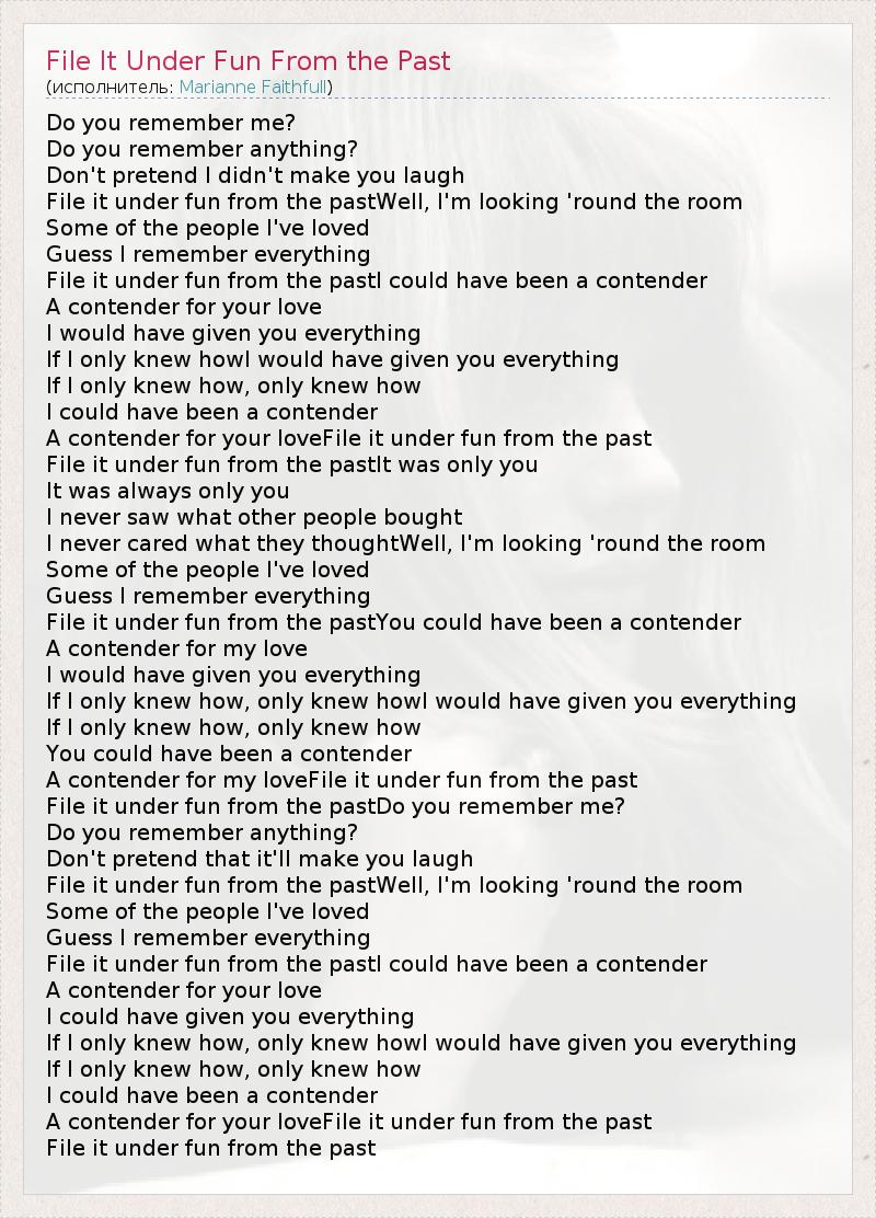 Do you remember me? Do you remember anything? Don't pretend I didn't make you laugh File it under fun from the pastWell, I'm looking 'round the room Some of the people I've loved Guess I remember everything File it under fun from the pastI could have been a contender A contender for your love I would have given you everything If I only knew howI would have given you everything If I only knew how, only knew how I could have been a contender A contender for your loveFile it under fun from the past File it under fun from the pastIt was only you It was always only you I never saw what other people bought I never cared what they thoughtWell, I'm looking 'round the room Some of the people I've loved Guess I remember everything File it under fun from the pastYou could have been a contender A contender for my love I would have given you everything If I only knew how, only knew howI would have given you everything If I only knew how, only knew how You could have been a contender A contender for my loveFile it under fun from the past File it under fun from the pastDo you remember me? Do you remember anything? Don't pretend that it'll make you laugh File it under fun from the pastWell, I'm looking 'round the room Some of the people I've loved Guess I remember everything File it under fun from the pastI could have been a contender A contender for your love I could have given you everything If I only knew how, only knew howI would have given you everything If I only knew how, only knew how I could have been a contender A contender for your loveFile it under fun from the past File it under fun from the past
