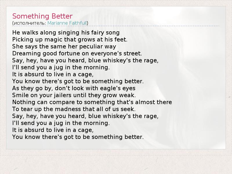 He walks along singing his fairy song Picking up magic that grows at his feet. She says the same her peculiar way Dreaming good fortune on everyone's street. Say, hey, have you heard, blue whiskey's the rage, I'll send you a jug in the morning. It is absurd to live in a cage, You know there's got to be something better. As they go by, don't look with eagle's eyes Smile on your jailers until they grow weak. Nothing can compare to something that's almost there To tear up the madness that all of us seek. Say, hey, have you heard, blue whiskey's the rage, I'll send you a jug in the morning. It is absurd to live in a cage, You know there's got to be something better.