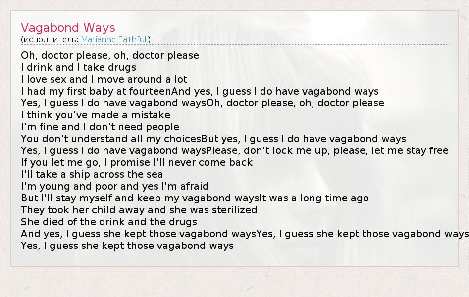 Oh, doctor please, oh, doctor please I drink and I take drugs I love sex and I move around a lot I had my first baby at fourteenAnd yes, I guess I do have vagabond ways Yes, I guess I do have vagabond waysOh, doctor please, oh, doctor please I think you've made a mistake I'm fine and I don't need people You don't understand all my choicesBut yes, I guess I do have vagabond ways Yes, I guess I do have vagabond waysPlease, don't lock me up, please, let me stay free If you let me go, I promise I'll never come back I'll take a ship across the sea I'm young and poor and yes I'm afraid But I'll stay myself and keep my vagabond waysIt was a long time ago They took her child away and she was sterilized She died of the drink and the drugs And yes, I guess she kept those vagabond waysYes, I guess she kept those vagabond ways Yes, I guess she kept those vagabond ways
