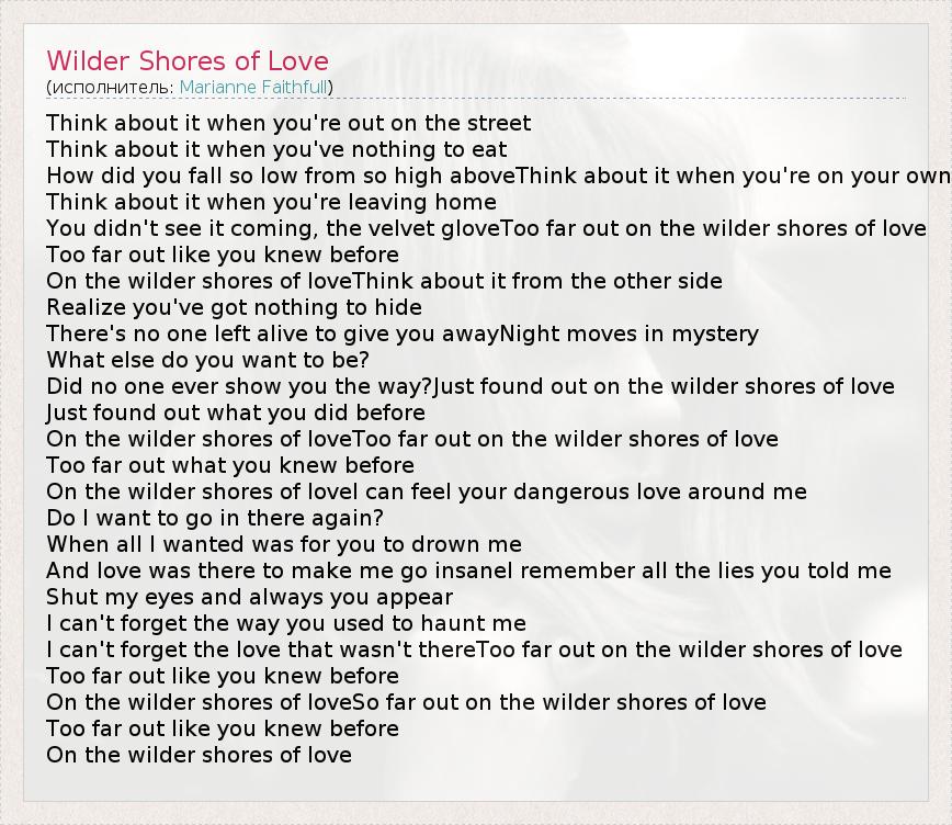 Think about it when you're out on the street Think about it when you've nothing to eat How did you fall so low from so high aboveThink about it when you're on your own Think about it when you're leaving home You didn't see it coming, the velvet gloveToo far out on the wilder shores of love Too far out like you knew before On the wilder shores of loveThink about it from the other side Realize you've got nothing to hide There's no one left alive to give you awayNight moves in mystery What else do you want to be? Did no one ever show you the way?Just found out on the wilder shores of love Just found out what you did before On the wilder shores of loveToo far out on the wilder shores of love Too far out what you knew before On the wilder shores of loveI can feel your dangerous love around me Do I want to go in there again? When all I wanted was for you to drown me And love was there to make me go insaneI remember all the lies you told me Shut my eyes and always you appear I can't forget the way you used to haunt me I can't forget the love that wasn't thereToo far out on the wilder shores of love Too far out like you knew before On the wilder shores of loveSo far out on the wilder shores of love Too far out like you knew before On the wilder shores of love