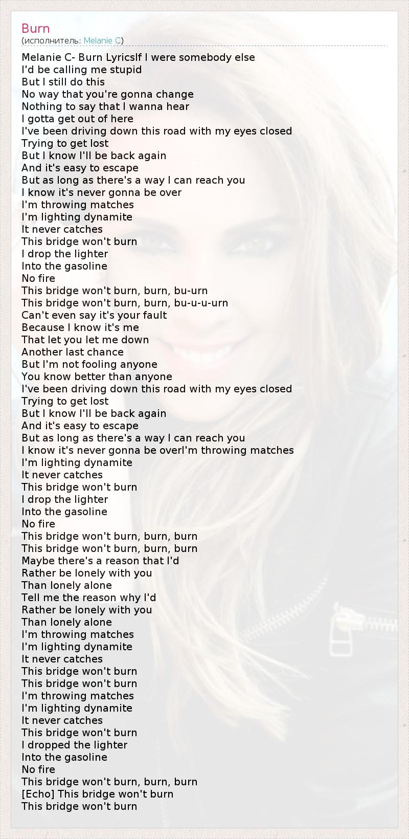 Melanie C- Burn LyricsIf I were somebody else I'd be calling me stupid But I still do this No way that you're gonna change Nothing to say that I wanna hear I gotta get out of here I've been driving down this road with my eyes closed Trying to get lost But I know I'll be back again And it's easy to escape But as long as there's a way I can reach you I know it's never gonna be over I'm throwing matches I'm lighting dynamite It never catches This bridge won't burn I drop the lighter Into the gasoline No fire This bridge won't burn, burn, bu-urn This bridge won't burn, burn, bu-u-u-urn Can't even say it's your fault Because I know it's me That let you let me down Another last chance But I'm not fooling anyone You know better than anyone I've been driving down this road with my eyes closed Trying to get lost But I know I'll be back again And it's easy to escape But as long as there's a way I can reach you I know it's never gonna be overI'm throwing matches I'm lighting dynamite It never catches This bridge won't burn I drop the lighter Into the gasoline No fire This bridge won't burn, burn, burn This bridge won't burn, burn, burn Maybe there's a reason that I'd Rather be lonely with you Than lonely alone Tell me the reason why I'd Rather be lonely with you Than lonely alone I'm throwing matches I'm lighting dynamite It never catches This bridge won't burn This bridge won't burn I'm throwing matches I'm lighting dynamite It never catches This bridge won't burn I dropped the lighter Into the gasoline No fire This bridge won't burn, burn, burn [Echo] This bridge won't burn This bridge won't burn