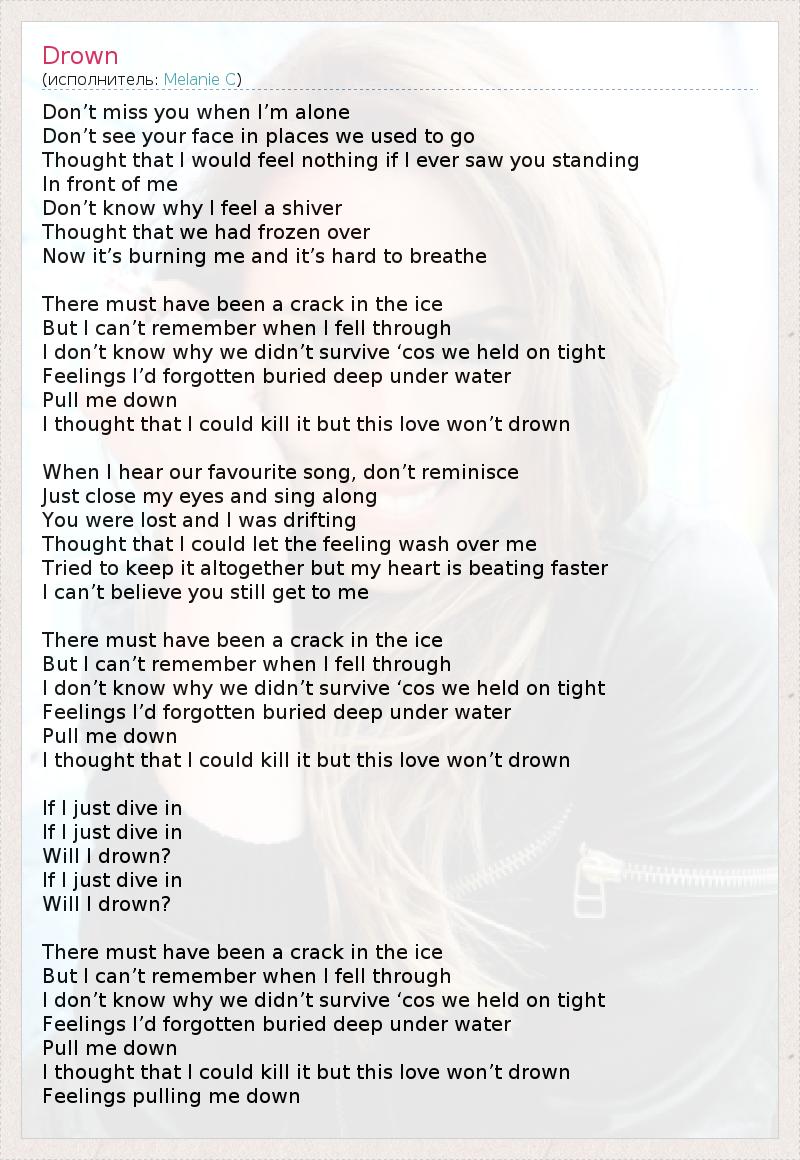 Don’t miss you when I’m alone Don’t see your face in places we used to go Thought that I would feel nothing if I ever saw you standing In front of me Don’t know why I feel a shiver Thought that we had frozen over Now it’s burning me and it’s hard to breathe There must have been a crack in the ice But I can’t remember when I fell through I don’t know why we didn’t survive ‘cos we held on tight Feelings I’d forgotten buried deep under water Pull me down I thought that I could kill it but this love won’t drown When I hear our favourite song, don’t reminisce Just close my eyes and sing along You were lost and I was drifting Thought that I could let the feeling wash over me Tried to keep it altogether but my heart is beating faster I can’t believe you still get to me There must have been a crack in the ice But I can’t remember when I fell through I don’t know why we didn’t survive ‘cos we held on tight Feelings I’d forgotten buried deep under water Pull me down I thought that I could kill it but this love won’t drown If I just dive in If I just dive in Will I drown? If I just dive in Will I drown? There must have been a crack in the ice But I can’t remember when I fell through I don’t know why we didn’t survive ‘cos we held on tight Feelings I’d forgotten buried deep under water Pull me down I thought that I could kill it but this love won’t drown Feelings pulling me down