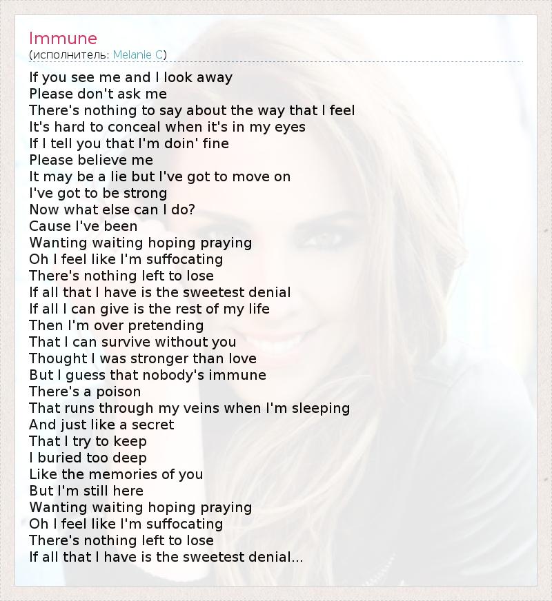 If you see me and I look away Please don't ask me There's nothing to say about the way that I feel It's hard to conceal when it's in my eyes If I tell you that I'm doin' fine Please believe me It may be a lie but I've got to move on I've got to be strong Now what else can I do? Cause I've been Wanting waiting hoping praying Oh I feel like I'm suffocating There's nothing left to lose If all that I have is the sweetest denial If all I can give is the rest of my life Then I'm over pretending That I can survive without you Thought I was stronger than love But I guess that nobody's immune There's a poison That runs through my veins when I'm sleeping And just like a secret That I try to keep I buried too deep Like the memories of you But I'm still here Wanting waiting hoping praying Oh I feel like I'm suffocating There's nothing left to lose If all that I have is the sweetest denial...