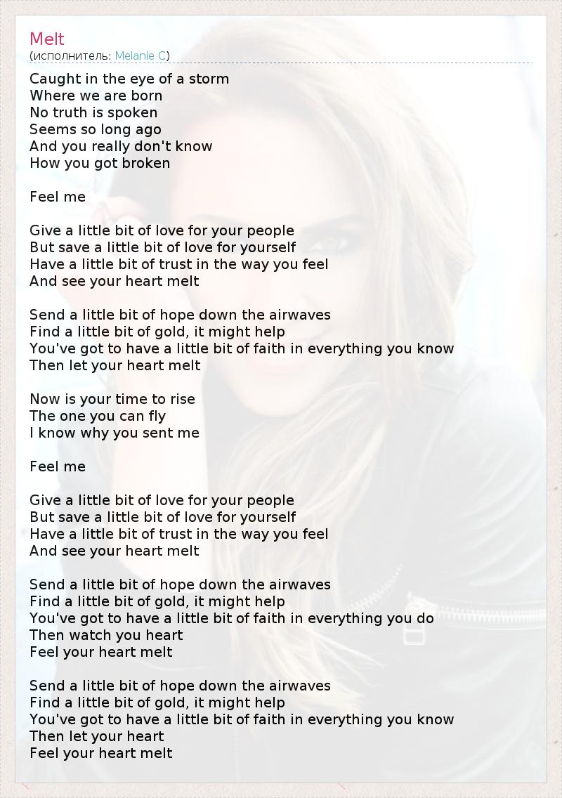 Caught in the eye of a storm Where we are born No truth is spoken Seems so long ago And you really don't know How you got broken Feel me Give a little bit of love for your people But save a little bit of love for yourself Have a little bit of trust in the way you feel And see your heart melt Send a little bit of hope down the airwaves Find a little bit of gold, it might help You've got to have a little bit of faith in everything you know Then let your heart melt Now is your time to rise The one you can fly I know why you sent me Feel me Give a little bit of love for your people But save a little bit of love for yourself Have a little bit of trust in the way you feel And see your heart melt Send a little bit of hope down the airwaves Find a little bit of gold, it might help You've got to have a little bit of faith in everything you do Then watch you heart Feel your heart melt Send a little bit of hope down the airwaves Find a little bit of gold, it might help You've got to have a little bit of faith in everything you know Then let your heart Feel your heart melt