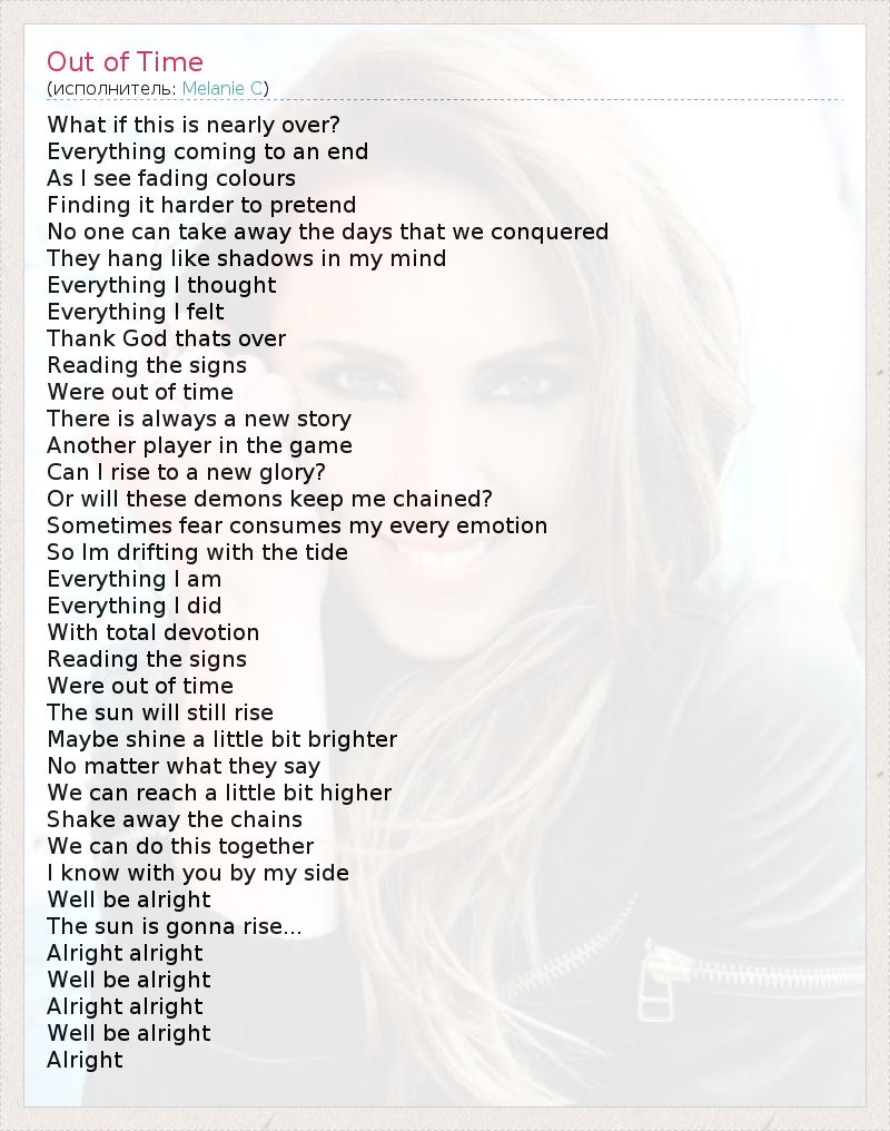 What if this is nearly over? Everything coming to an end As I see fading colours Finding it harder to pretend No one can take away the days that we conquered They hang like shadows in my mind Everything I thought Everything I felt Thank God thats over Reading the signs Were out of time There is always a new story Another player in the game Can I rise to a new glory? Or will these demons keep me chained? Sometimes fear consumes my every emotion So Im drifting with the tide Everything I am Everything I did With total devotion Reading the signs Were out of time The sun will still rise Maybe shine a little bit brighter No matter what they say We can reach a little bit higher Shake away the chains We can do this together I know with you by my side Well be alright The sun is gonna rise... Alright alright Well be alright Alright alright Well be alright Alright