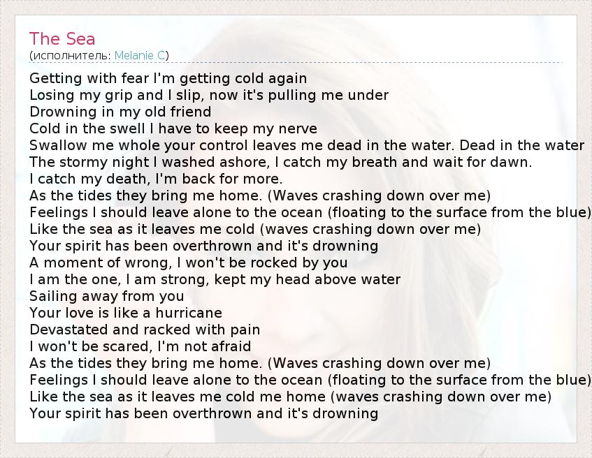Getting with fear I'm getting cold again Losing my grip and I slip, now it's pulling me under Drowning in my old friend Cold in the swell I have to keep my nerve Swallow me whole your control leaves me dead in the water. Dead in the water The stormy night I washed ashore, I catch my breath and wait for dawn. I catch my death, I'm back for more. As the tides they bring me home. (Waves crashing down over me) Feelings I should leave alone to the ocean (floating to the surface from the blue) Like the sea as it leaves me cold (waves crashing down over me) Your spirit has been overthrown and it's drowning A moment of wrong, I won't be rocked by you I am the one, I am strong, kept my head above water Sailing away from you Your love is like a hurricane Devastated and racked with pain I won't be scared, I'm not afraid As the tides they bring me home. (Waves crashing down over me) Feelings I should leave alone to the ocean (floating to the surface from the blue) Like the sea as it leaves me cold me home (waves crashing down over me) Your spirit has been overthrown and it's drowning