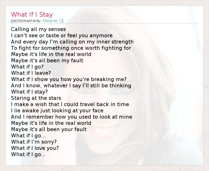 Calling all my senses I can't see or taste or feel you anymore And every day I'm calling on my inner strength To fight for something once worth fighting for Maybe it's life in the real world Maybe it's all been my fault What if I go? What if I leave? What if I show you how you're breaking me? And I know, whatever I say I'll still be thinking What if I stay? Staring at the stars I make a wish that I could travel back in time I lie awake just looking at your face And I remember how you used to look at mine Maybe it's life in the real world Maybe it's all been your fault What if I go... What if I'm sorry? What if I love you? What if I go...