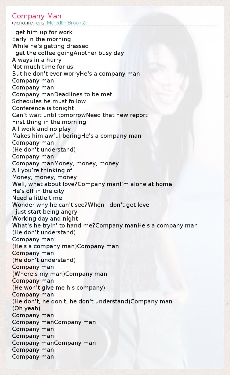 I get him up for work Early in the morning While he's getting dressed I get the coffee goingAnother busy day Always in a hurry Not much time for us But he don't ever worryHe's a company man Company man Company man Company manDeadlines to be met Schedules he must follow Conference is tonight Can't wait until tomorrowNeed that new report First thing in the morning All work and no play Makes him awful boringHe's a company man Company man (He don't understand) Company man Company manMoney, money, money All you're thinking of Money, money, money Well, what about love?Company manI'm alone at home He's off in the city Need a little time Wonder why he can't see?When I don't get love I just start being angry Working day and night What's he tryin' to hand me?Company manHe's a company man (He don't understand) Company man (He's a company man)Company man Company man (He don't understand) Company man (Where's my man)Company man Company man (He won't give me his company) Company man (He don't, he don't, he don't understand)Company man (Oh yeah) Company man Company manCompany man Company man Company man Company manCompany man Company man Company man