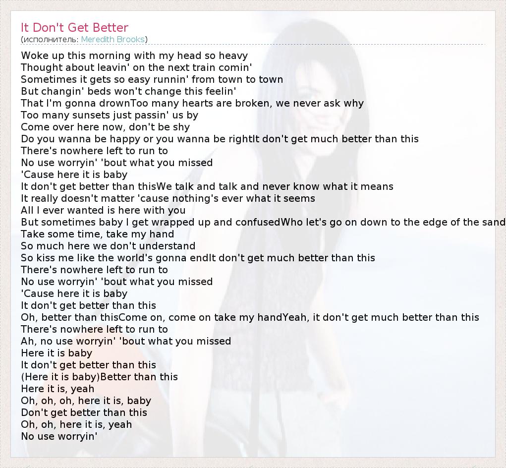 Woke up this morning with my head so heavy Thought about leavin' on the next train comin' Sometimes it gets so easy runnin' from town to town But changin' beds won't change this feelin' That I'm gonna drownToo many hearts are broken, we never ask why Too many sunsets just passin' us by Come over here now, don't be shy Do you wanna be happy or you wanna be rightIt don't get much better than this There's nowhere left to run to No use worryin' 'bout what you missed 'Cause here it is baby It don't get better than thisWe talk and talk and never know what it means It really doesn't matter 'cause nothing's ever what it seems All I ever wanted is here with you But sometimes baby I get wrapped up and confusedWho let's go on down to the edge of the sand Take some time, take my hand So much here we don't understand So kiss me like the world's gonna endIt don't get much better than this There's nowhere left to run to No use worryin' 'bout what you missed 'Cause here it is baby It don't get better than this Oh, better than thisCome on, come on take my handYeah, it don't get much better than this There's nowhere left to run to Ah, no use worryin' 'bout what you missed Here it is baby It don't get better than this (Here it is baby)Better than this Here it is, yeah Oh, oh, oh, here it is, baby Don't get better than this Oh, oh, here it is, yeah No use worryin'