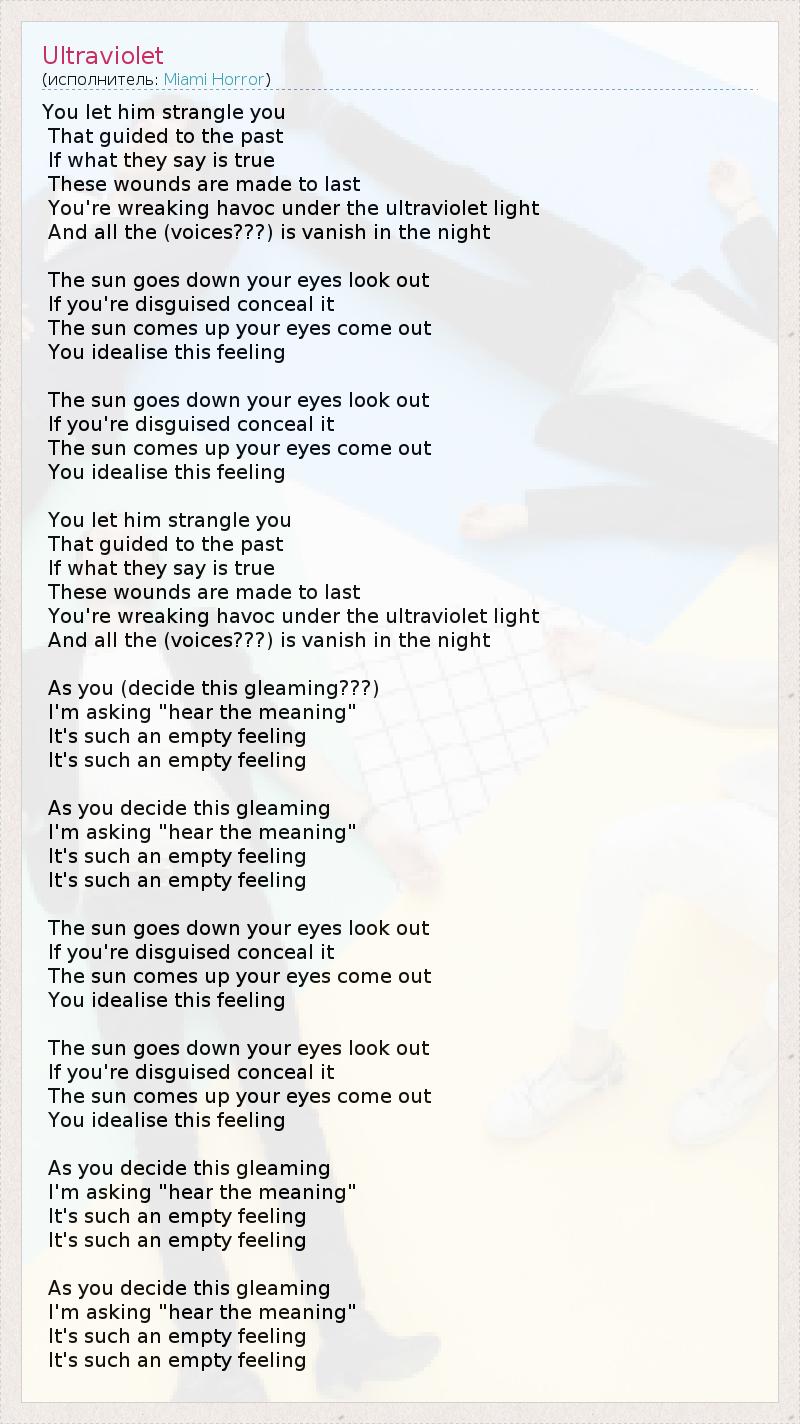 You let him strangle you That guided to the past If what they say is true These wounds are made to last You're wreaking havoc under the ultraviolet light And all the (voices???) is vanish in the night The sun goes down your eyes look out If you're disguised conceal it The sun comes up your eyes come out You idealise this feeling The sun goes down your eyes look out If you're disguised conceal it The sun comes up your eyes come out You idealise this feeling You let him strangle you That guided to the past If what they say is true These wounds are made to last You're wreaking havoc under the ultraviolet light And all the (voices???) is vanish in the night As you (decide this gleaming???) I'm asking "hear the meaning" It's such an empty feeling It's such an empty feeling As you decide this gleaming I'm asking "hear the meaning" It's such an empty feeling It's such an empty feeling The sun goes down your eyes look out If you're disguised conceal it The sun comes up your eyes come out You idealise this feeling The sun goes down your eyes look out If you're disguised conceal it The sun comes up your eyes come out You idealise this feeling As you decide this gleaming I'm asking "hear the meaning" It's such an empty feeling It's such an empty feeling As you decide this gleaming I'm asking "hear the meaning" It's such an empty feeling It's such an empty feeling