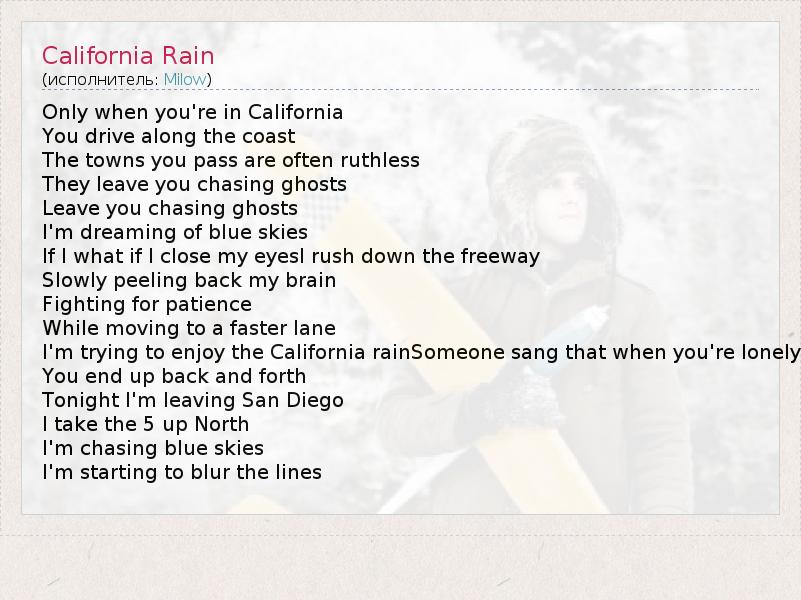 Only when you're in California You drive along the coast The towns you pass are often ruthless They leave you chasing ghosts Leave you chasing ghosts I'm dreaming of blue skies If I what if I close my eyesI rush down the freeway Slowly peeling back my brain Fighting for patience While moving to a faster lane I'm trying to enjoy the California rainSomeone sang that when you're lonely You end up back and forth Tonight I'm leaving San Diego I take the 5 up North I'm chasing blue skies I'm starting to blur the lines