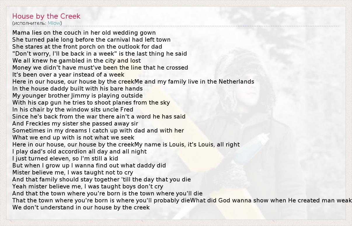 Mama lies on the couch in her old wedding gown She turned pale long before the carnival had left town She stares at the front porch on the outlook for dad "Don't worry, I'll be back in a week" is the last thing he said We all knew he gambled in the city and lost Money we didn't have must've been the line that he crossed It's been over a year instead of a week Here in our house, our house by the creekMe and my family live in the Netherlands In the house daddy built with his bare hands My younger brother Jimmy is playing outside With his cap gun he tries to shoot planes from the sky In his chair by the window sits uncle Fred Since he's back from the war there ain't a word he has said And Freckles my sister she passed away sir Sometimes in my dreams I catch up with dad and with her What we end up with is not what we seek Here in our house, our house by the creekMy name is Louis, it's Louis, all right I play dad's old accordion all day and all night I just turned eleven, so I'm still a kid But when I grow up I wanna find out what daddy did Mister believe me, I was taught not to cry And that family should stay together 'till the day that you die Yeah mister believe me, I was taught boys don't cry And that the town where you're born is the town where you'll die That the town where you're born is where you'll probably dieWhat did God wanna show when He created man weak We don't understand in our house by the creek
