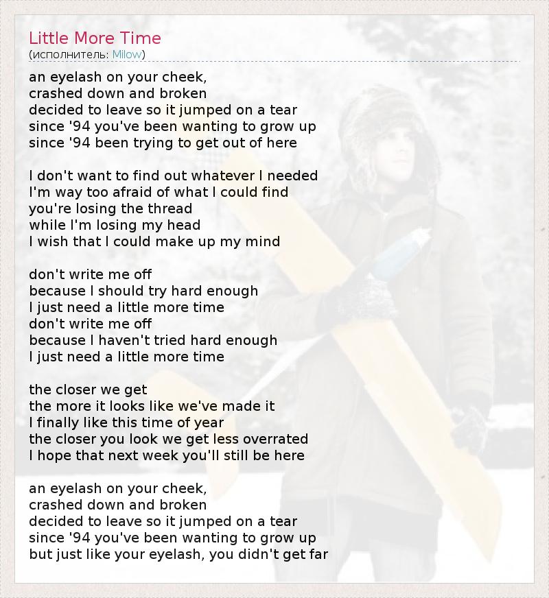 an eyelash on your cheek, crashed down and broken decided to leave so it jumped on a tear since '94 you've been wanting to grow up since '94 been trying to get out of here I don't want to find out whatever I needed I'm way too afraid of what I could find you're losing the thread while I'm losing my head I wish that I could make up my mind don't write me off because I should try hard enough I just need a little more time don't write me off because I haven't tried hard enough I just need a little more time the closer we get the more it looks like we've made it I finally like this time of year the closer you look we get less overrated I hope that next week you'll still be here an eyelash on your cheek, crashed down and broken decided to leave so it jumped on a tear since '94 you've been wanting to grow up but just like your eyelash, you didn't get far