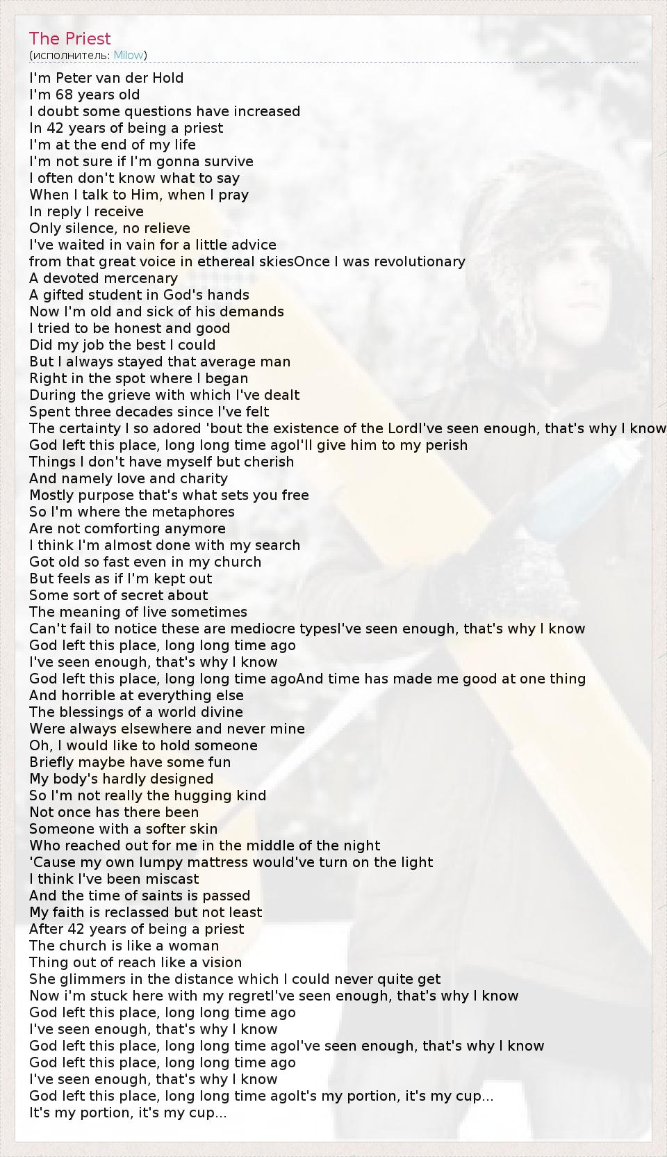 I'm Peter van der Hold I'm 68 years old I doubt some questions have increased In 42 years of being a priest I'm at the end of my life I'm not sure if I'm gonna survive I often don't know what to say When I talk to Him, when I pray In reply I receive Only silence, no relieve I've waited in vain for a little advice from that great voice in ethereal skiesOnce I was revolutionary A devoted mercenary A gifted student in God's hands Now I'm old and sick of his demands I tried to be honest and good Did my job the best I could But I always stayed that average man Right in the spot where I began During the grieve with which I've dealt Spent three decades since I've felt The certainty I so adored 'bout the existence of the LordI've seen enough, that's why I know God left this place, long long time agoI'll give him to my perish Things I don't have myself but cherish And namely love and charity Mostly purpose that's what sets you free So I'm where the metaphores Are not comforting anymore I think I'm almost done with my search Got old so fast even in my church But feels as if I'm kept out Some sort of secret about The meaning of live sometimes Can't fail to notice these are mediocre typesI've seen enough, that's why I know God left this place, long long time ago I've seen enough, that's why I know God left this place, long long time agoAnd time has made me good at one thing And horrible at everything else The blessings of a world divine Were always elsewhere and never mine Oh, I would like to hold someone Briefly maybe have some fun My body's hardly designed So I'm not really the hugging kind Not once has there been Someone with a softer skin Who reached out for me in the middle of the night 'Cause my own lumpy mattress would've turn on the light I think I've been miscast And the time of saints is passed My faith is reclassed but not least After 42 years of being a priest The church is like a woman Thing out of reach like a vision She glimmers in the distance which I could never quite get Now i'm stuck here with my regretI've seen enough, that's why I know God left this place, long long time ago I've seen enough, that's why I know God left this place, long long time agoI've seen enough, that's why I know God left this place, long long time ago I've seen enough, that's why I know God left this place, long long time agoIt's my portion, it's my cup... It's my portion, it's my cup...