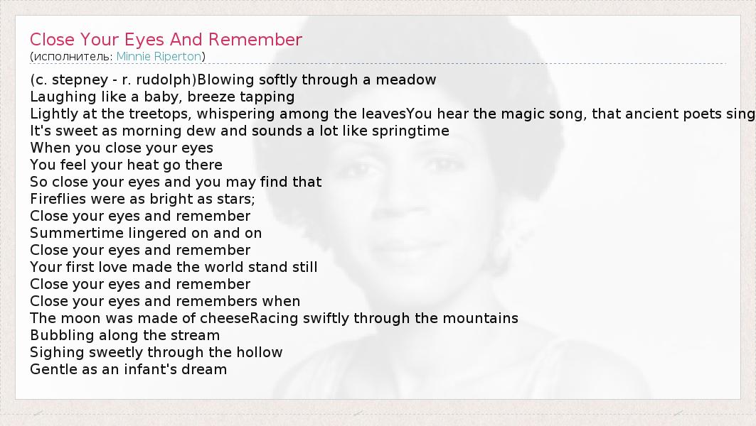 ГлавнаяИсполнителиMinnie RipertonClose Your Eyes And Remember