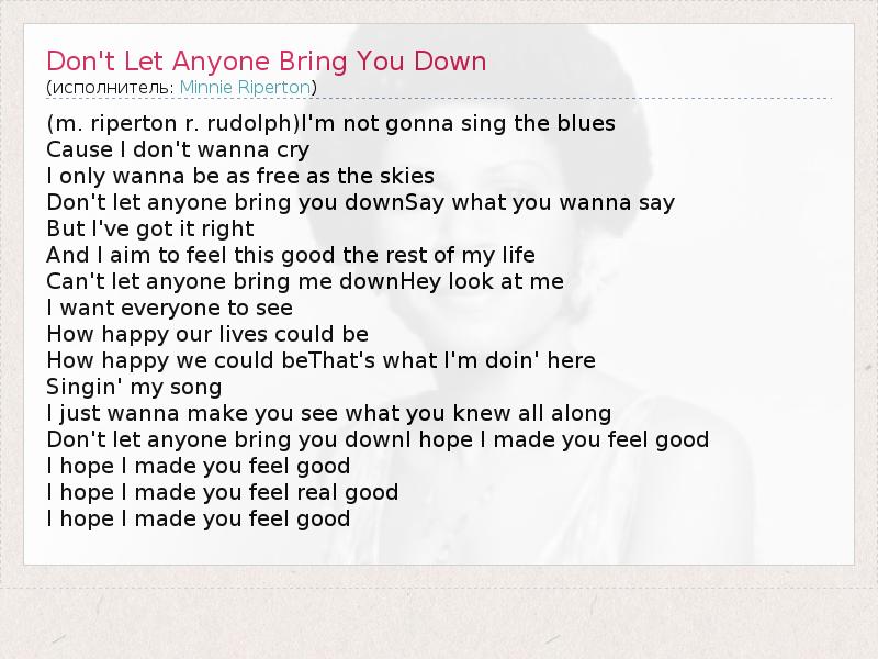 ГлавнаяИсполнителиMinnie RipertonDon't Let Anyone Bring You Down